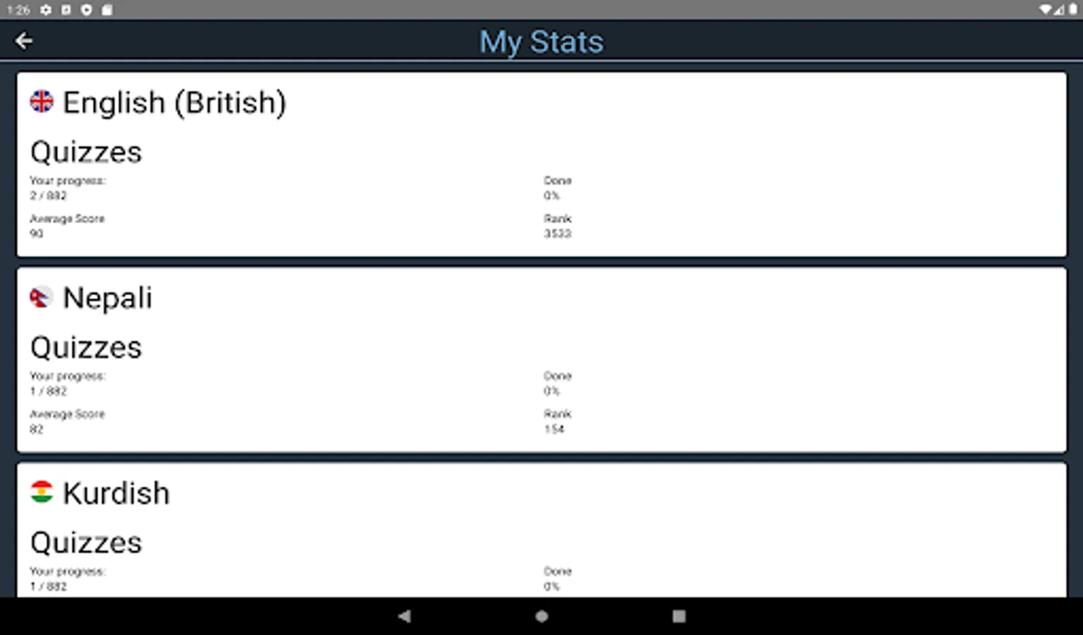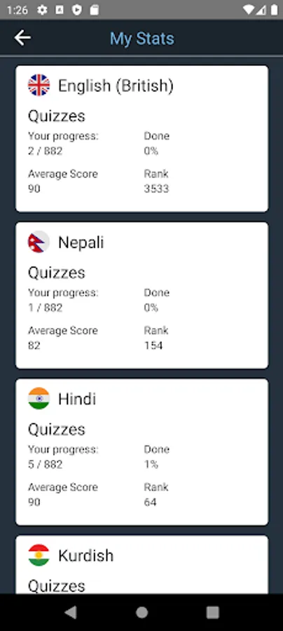 1) Free. You can take the Comprehensive British English Test (non-adaptive) in any language, containing 882 quizzes, and receive a free certificate of proficiency with your CEFR score upon completion. The comprehensive test is the largest such test in the world and takes about 70 hours to complete. You can do the test at your own pace, over as many days as you like. A leaderboard displays your rank against all other test-takers worldwide, and you can easily track your progress at any time.