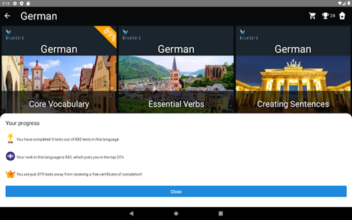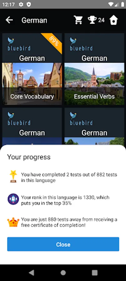 Bluebird German Tests evaluates your knowledge of German and provides an official PDF certificate of proficiency with your CEFR score (Common European Framework of Reference for Languages).