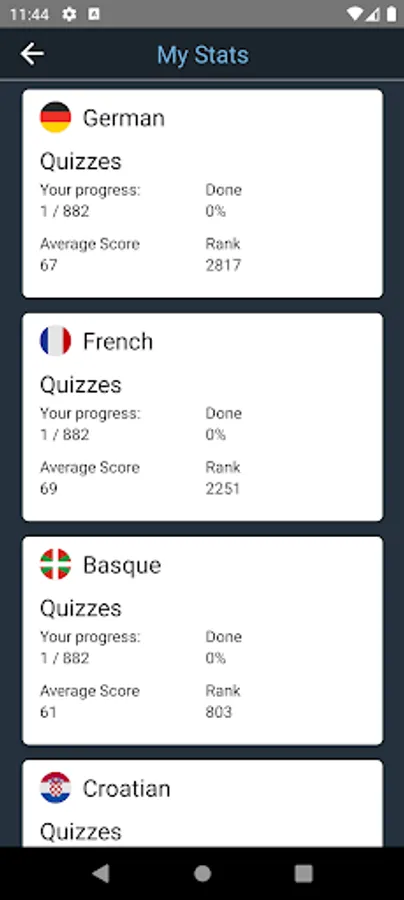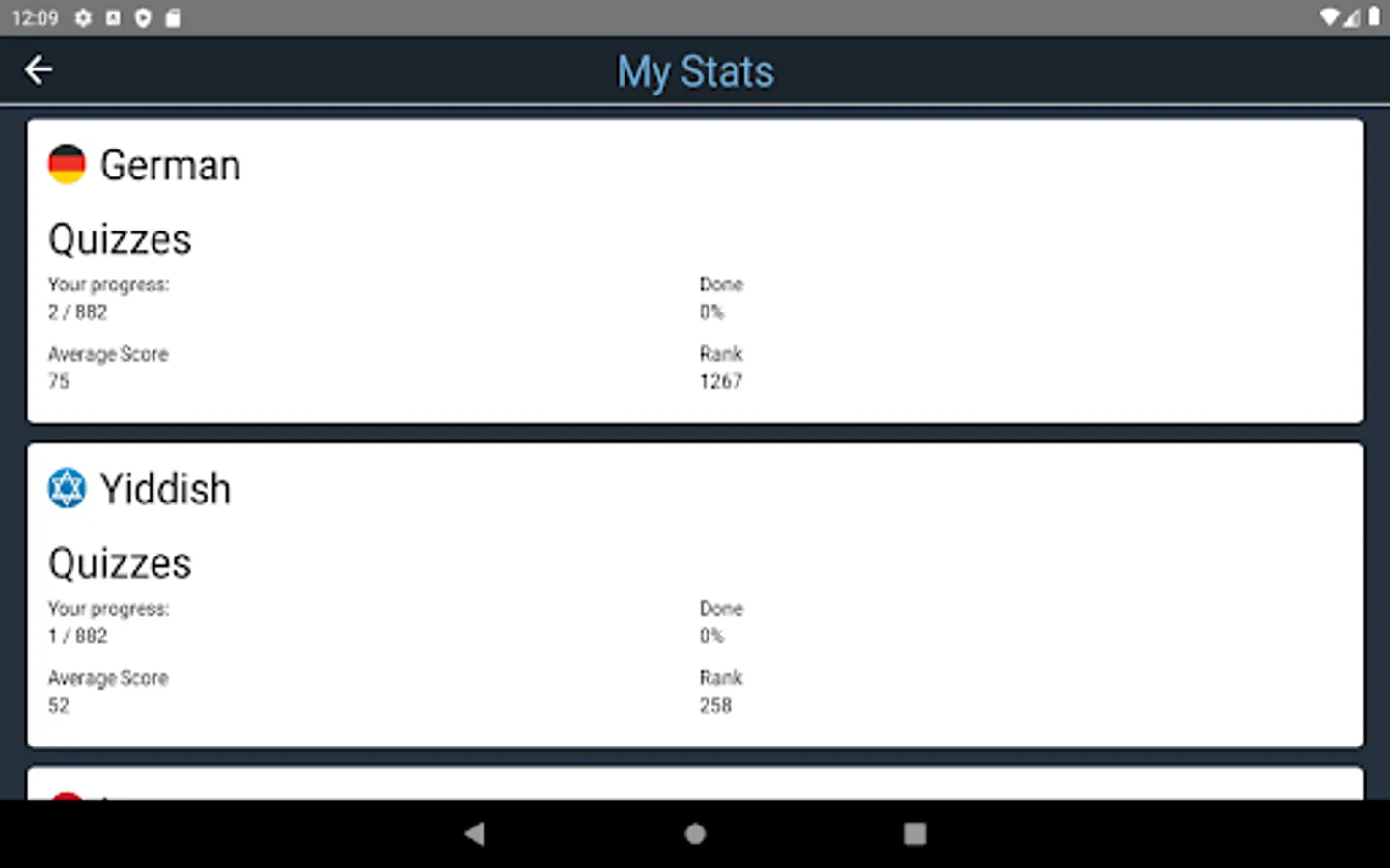 1) Free. You can take the Comprehensive German Test (non-adaptive) in any language, containing 882 quizzes, and receive a free certificate of proficiency with your CEFR score upon completion. The comprehensive test is the largest such test in the world and takes about 70 hours to complete. You can do the test at your own pace, over as many days as you like. A leaderboard displays your rank against all other test-takers worldwide, and you can easily track your progress at any time.