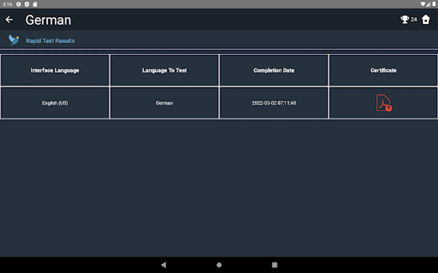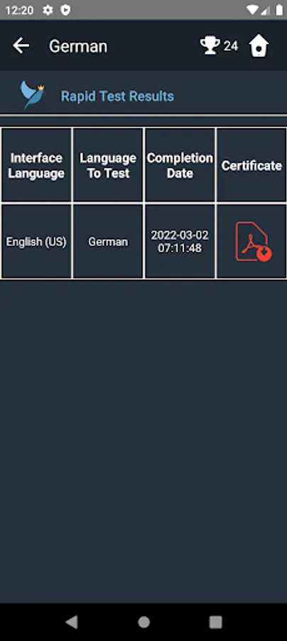 2) Paid. For a low fee, you can take our Rapid German Adaptive test, which will provide you with a certificate of proficiency with your CEFR score in just 45 minutes. The rapid test uses questions that are progressively more difficult to accurately gauge your level of proficiency.