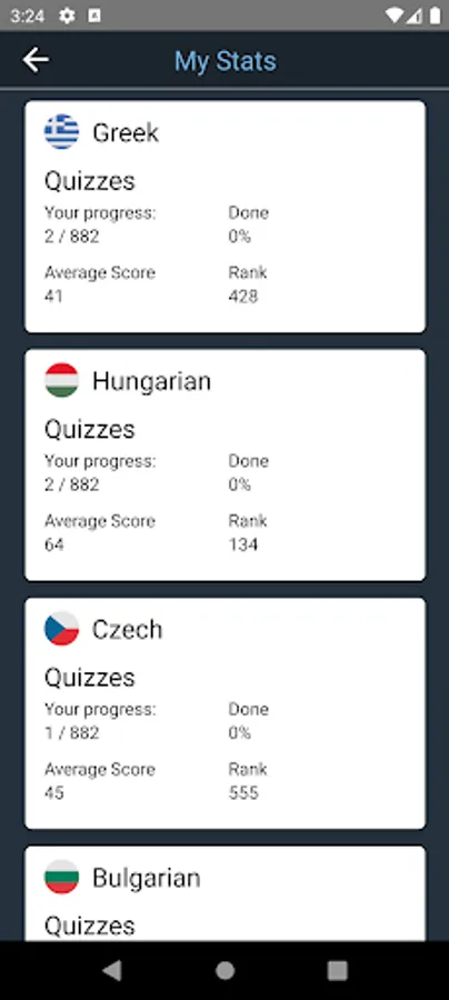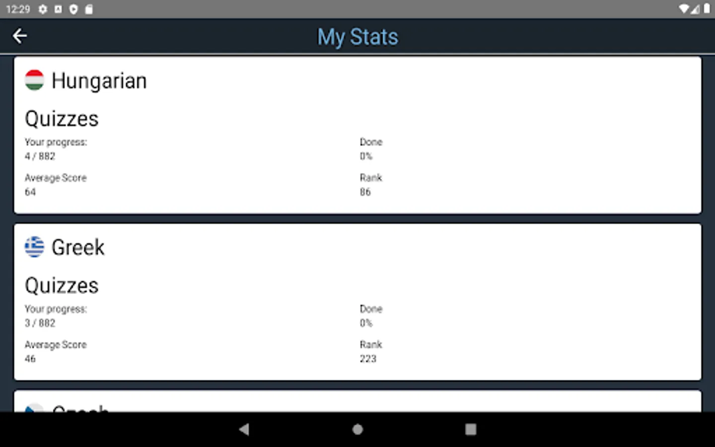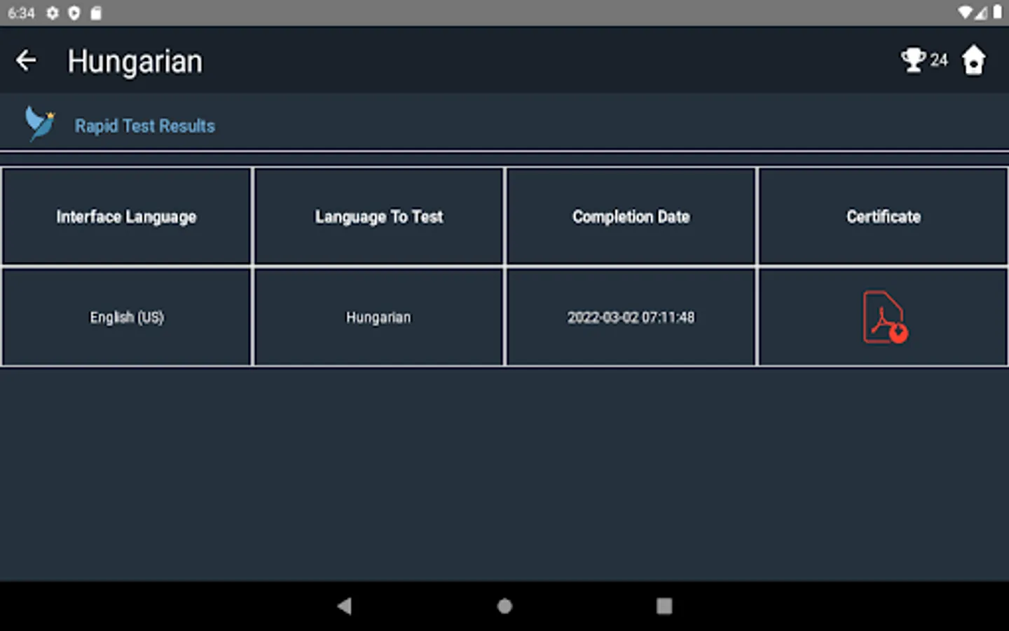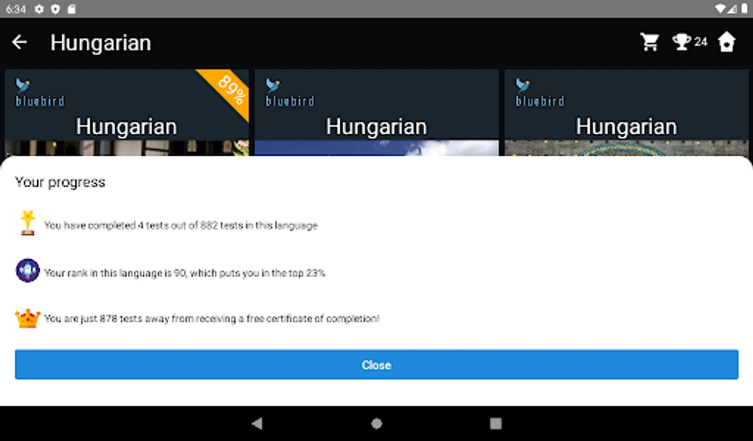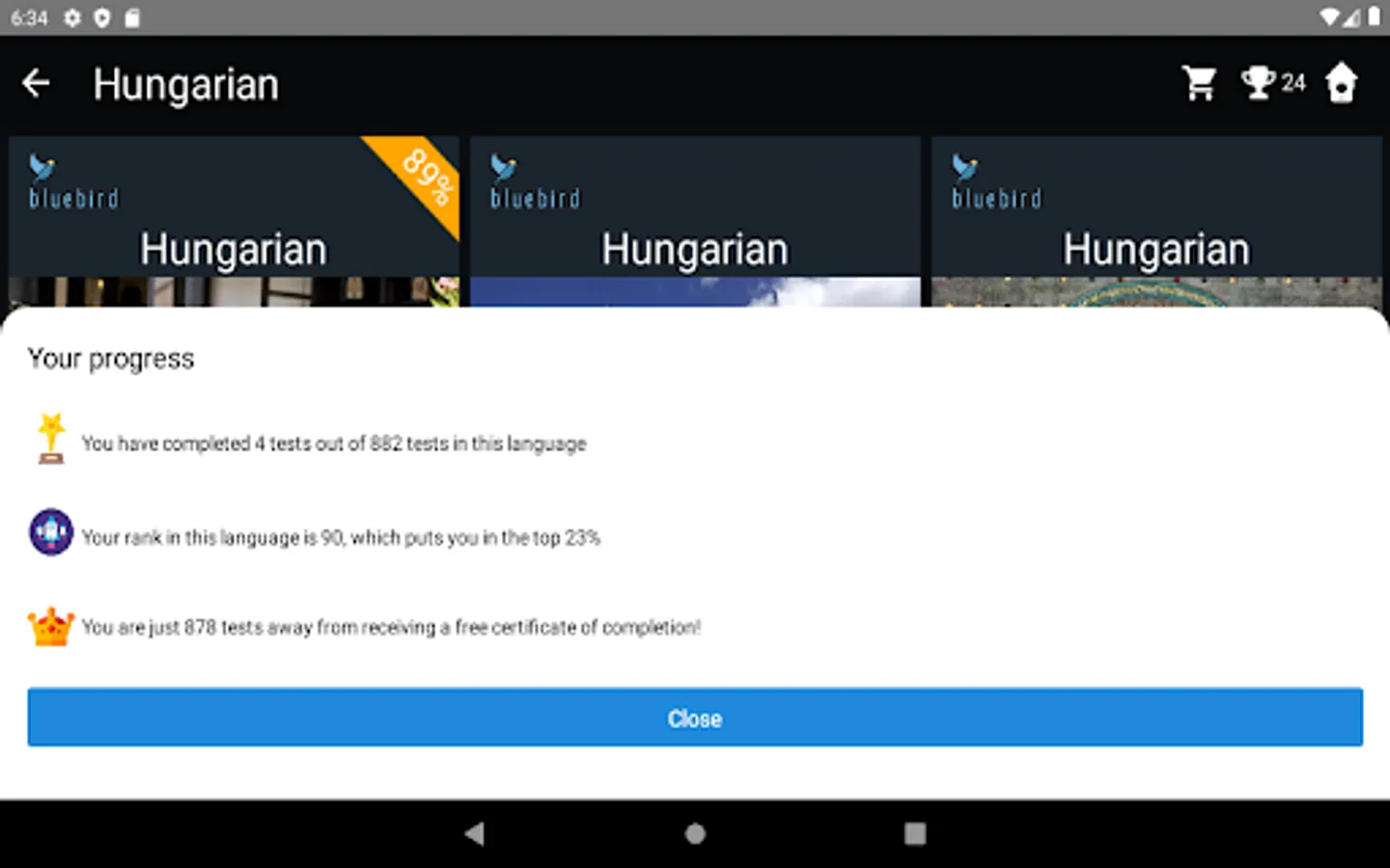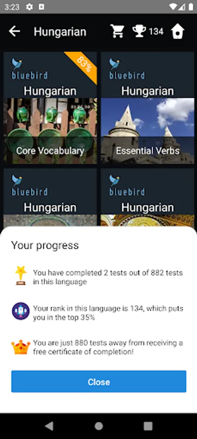1) Free. You can take the Comprehensive Hungarian Test (non-adaptive) in any language, containing 882 quizzes, and receive a free certificate of proficiency with your CEFR score upon completion. The comprehensive test is the largest such test in the world and takes about 70 hours to complete. You can do the test at your own pace, over as many days as you like. A leaderboard displays your rank against all other test-takers worldwide, and you can easily track your progress at any time.