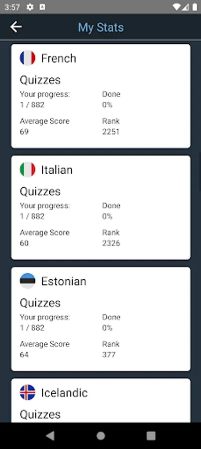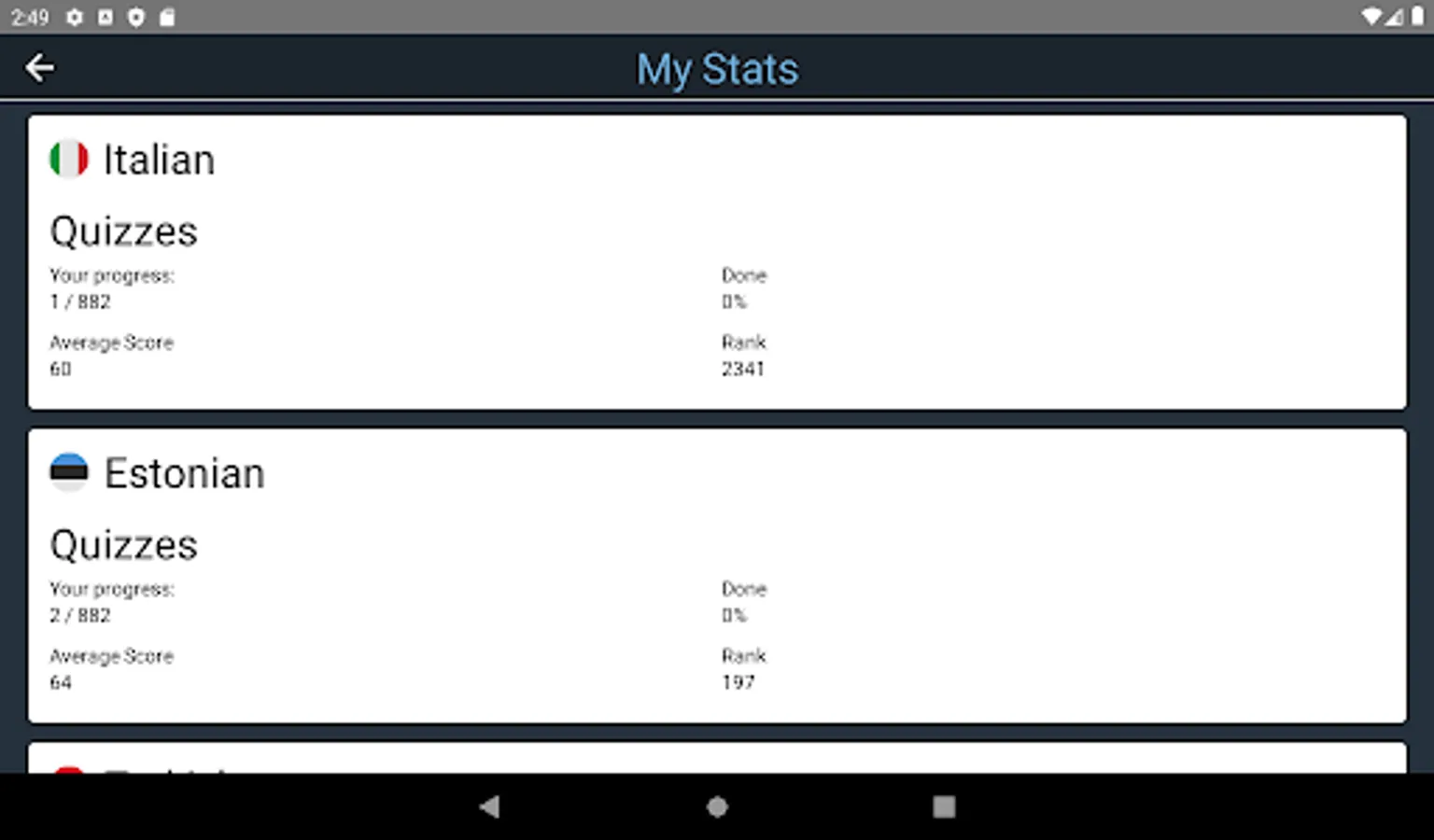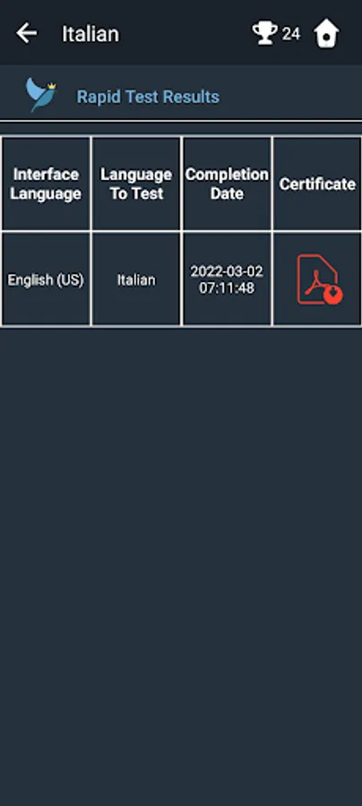 1) Free. You can take the Comprehensive Italian Test (non-adaptive) in any language, containing 882 quizzes, and receive a free certificate of proficiency with your CEFR score upon completion. The comprehensive test is the largest such test in the world and takes about 70 hours to complete. You can do the test at your own pace, over as many days as you like. A leaderboard displays your rank against all other test-takers worldwide, and you can easily track your progress at any time.
