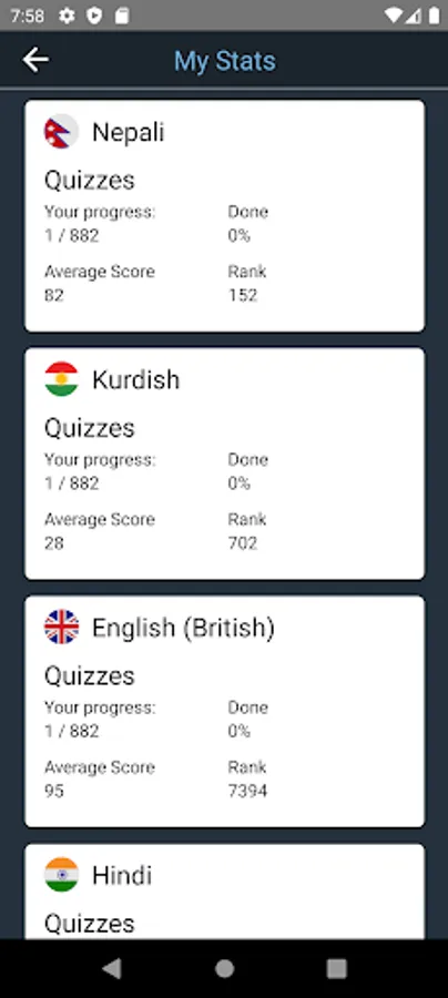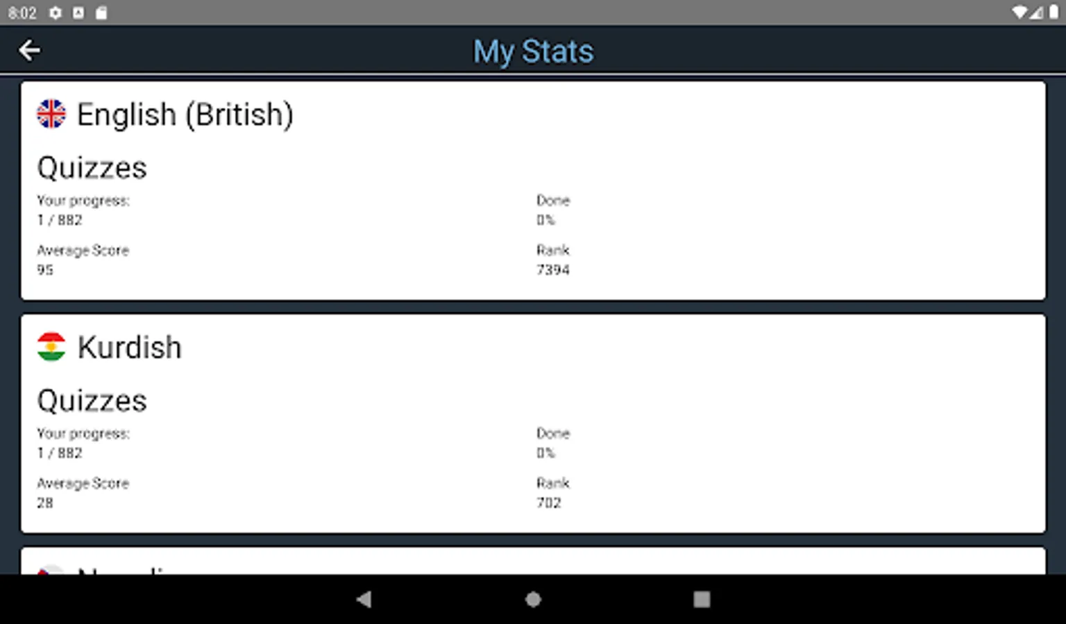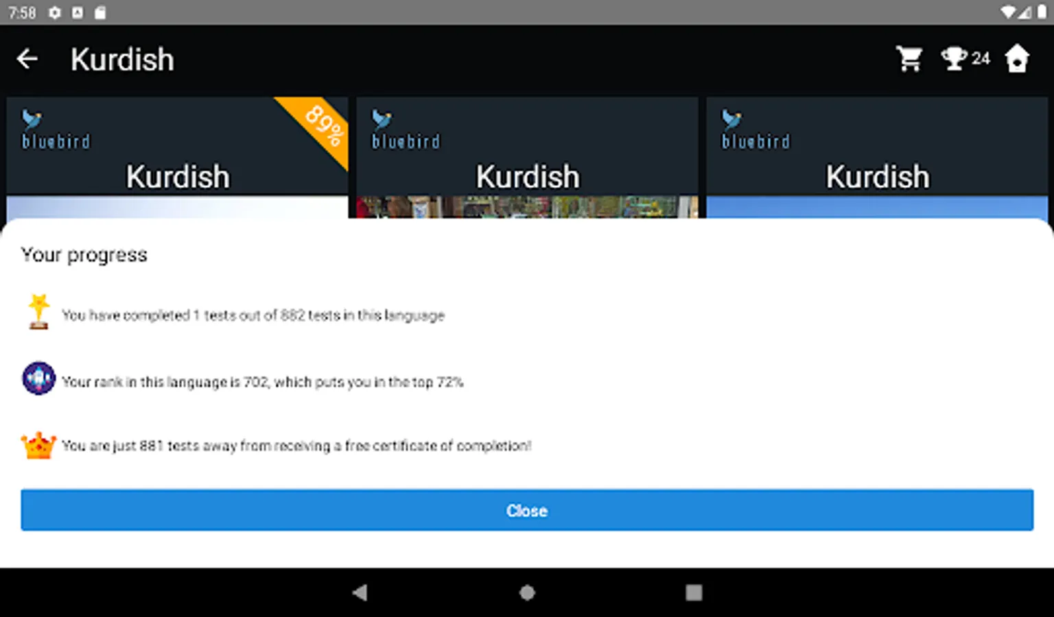 1) Free. You can take the Comprehensive Kurdish Test (non-adaptive) in any language, containing 882 quizzes, and receive a free certificate of proficiency with your CEFR score upon completion. The comprehensive test is the largest such test in the world and takes about 70 hours to complete. You can do the test at your own pace, over as many days as you like. A leaderboard displays your rank against all other test-takers worldwide, and you can easily track your progress at any time.