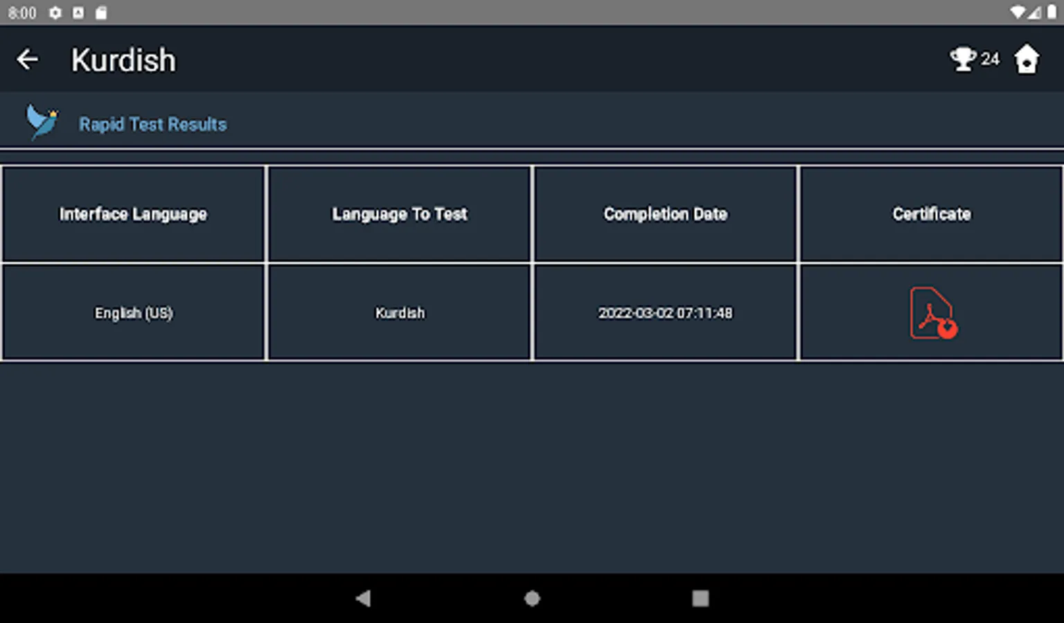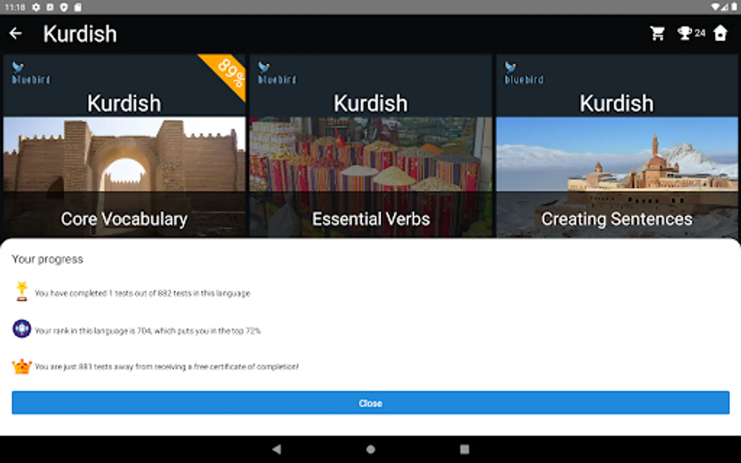 Bluebird Kurdish Tests evaluates your knowledge of Kurdish and provides an official PDF certificate of proficiency with your CEFR score (Common European Framework of Reference for Languages).