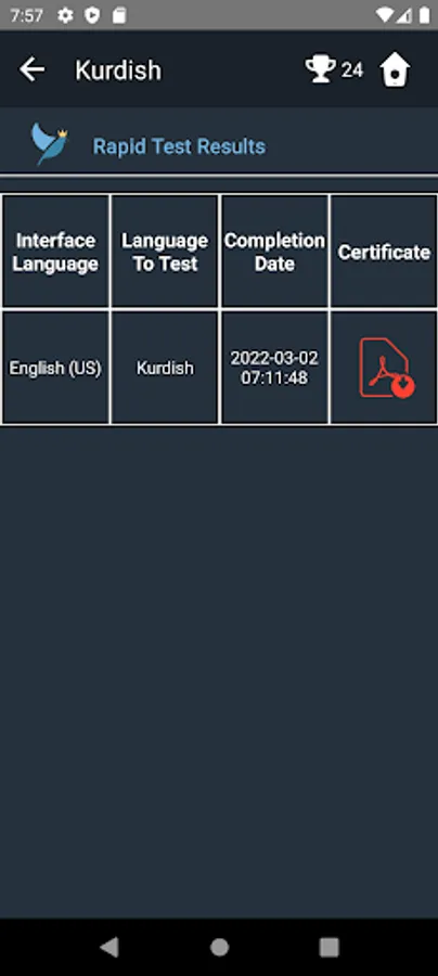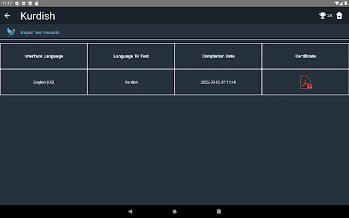 2) Paid. For a low fee, you can take our Rapid Kurdish Adaptive test, which will provide you with a certificate of proficiency with your CEFR score in just 45 minutes. The rapid test uses questions that are progressively more difficult to accurately gauge your level of proficiency.