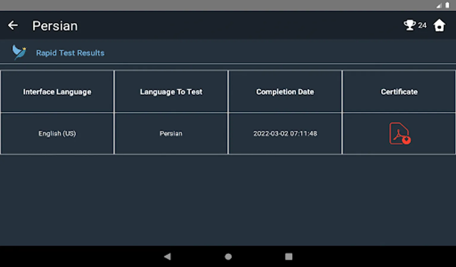 2) Paid. For a low fee, you can take our Rapid Persian Adaptive test, which will provide you with a certificate of proficiency with your CEFR score in just 45 minutes. The rapid test uses questions that are progressively more difficult to accurately gauge your level of proficiency.