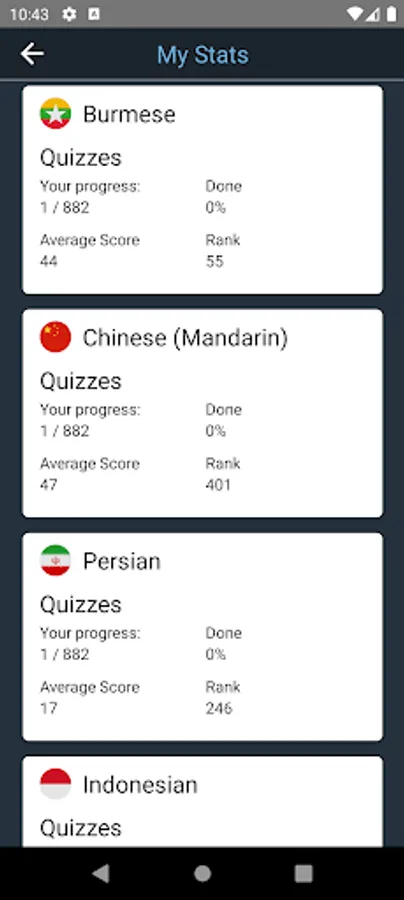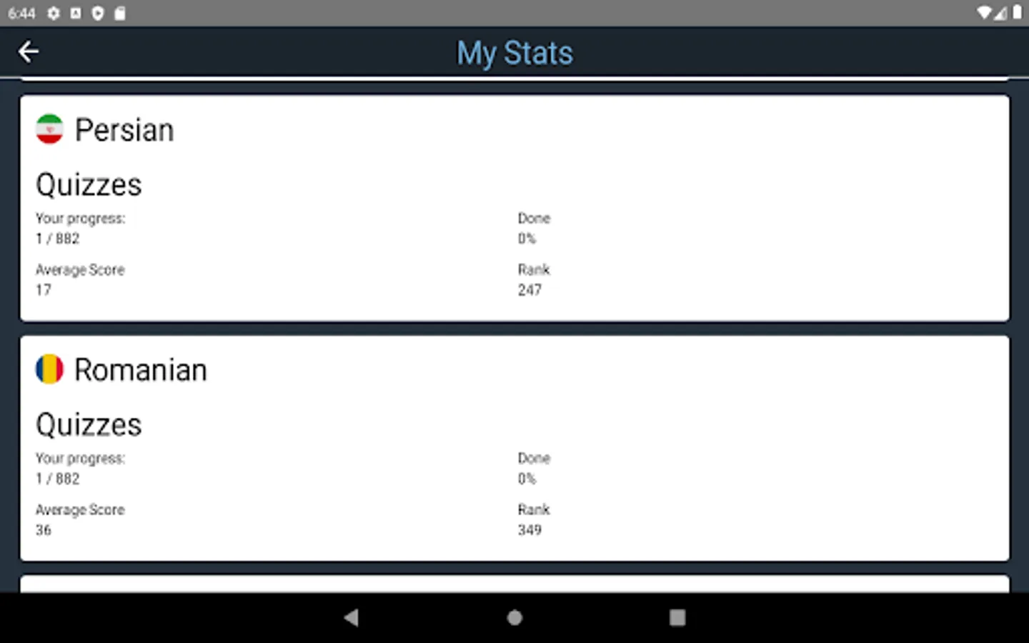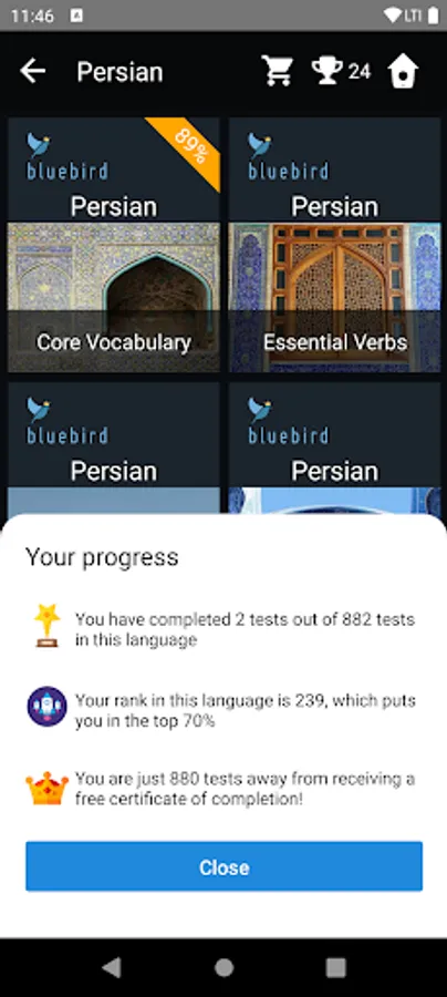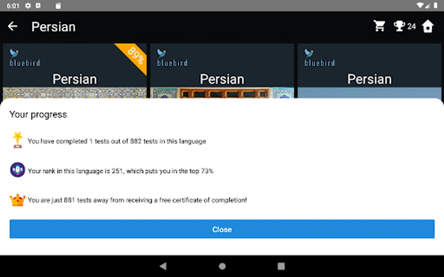 1) Free. You can take the Comprehensive Persian Test (non-adaptive) in any language, containing 882 quizzes, and receive a free certificate of proficiency with your CEFR score upon completion. The comprehensive test is the largest such test in the world and takes about 70 hours to complete. You can do the test at your own pace, over as many days as you like. A leaderboard displays your rank against all other test-takers worldwide, and you can easily track your progress at any time.