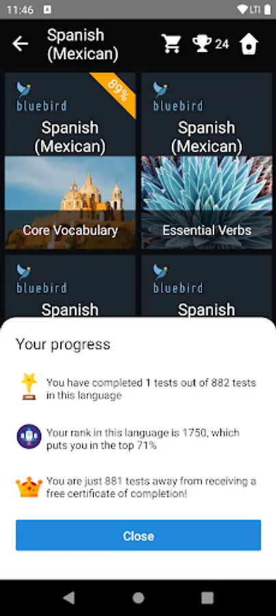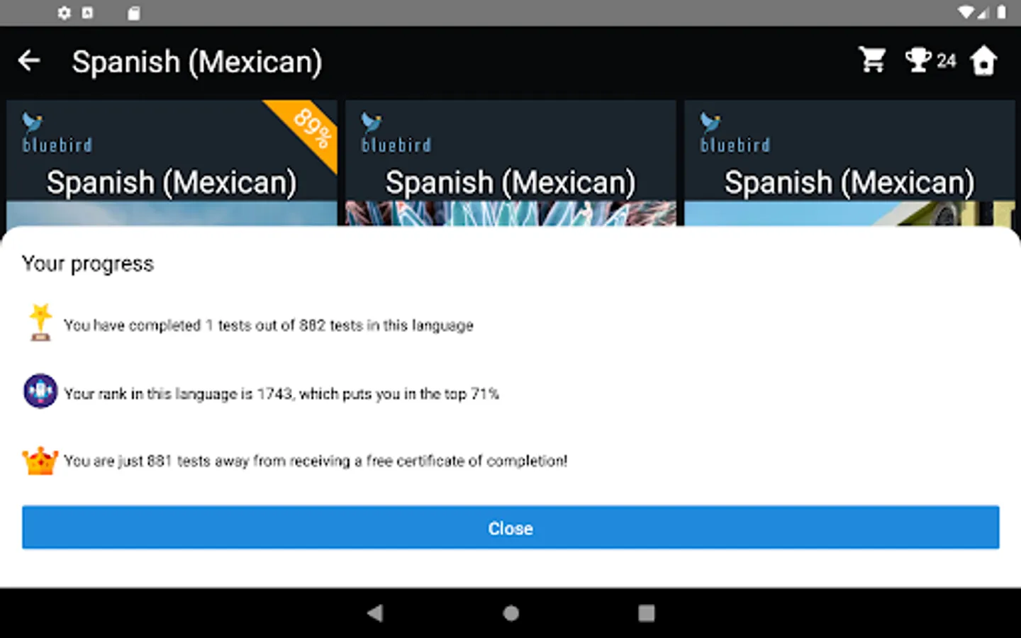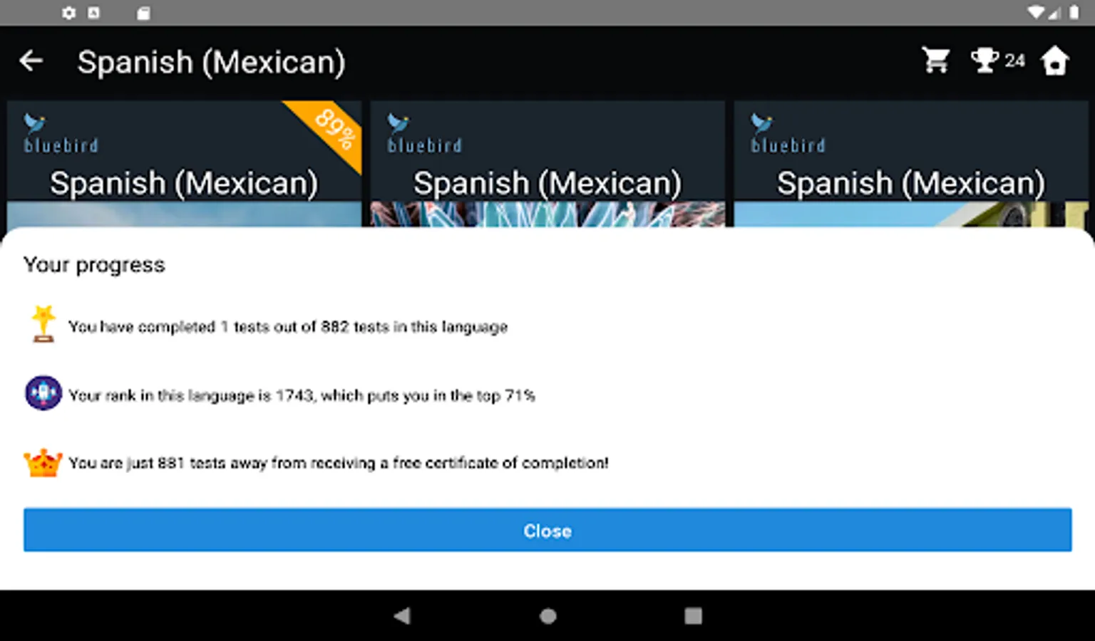Bluebird Mexican Spanish Tests evaluates your knowledge of Mexican Spanish and provides an official PDF certificate of proficiency with your CEFR score (Common European Framework of Reference for Languages).