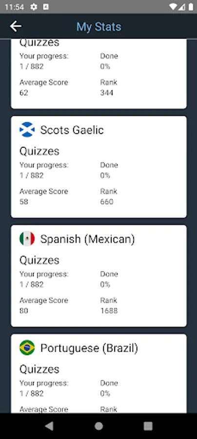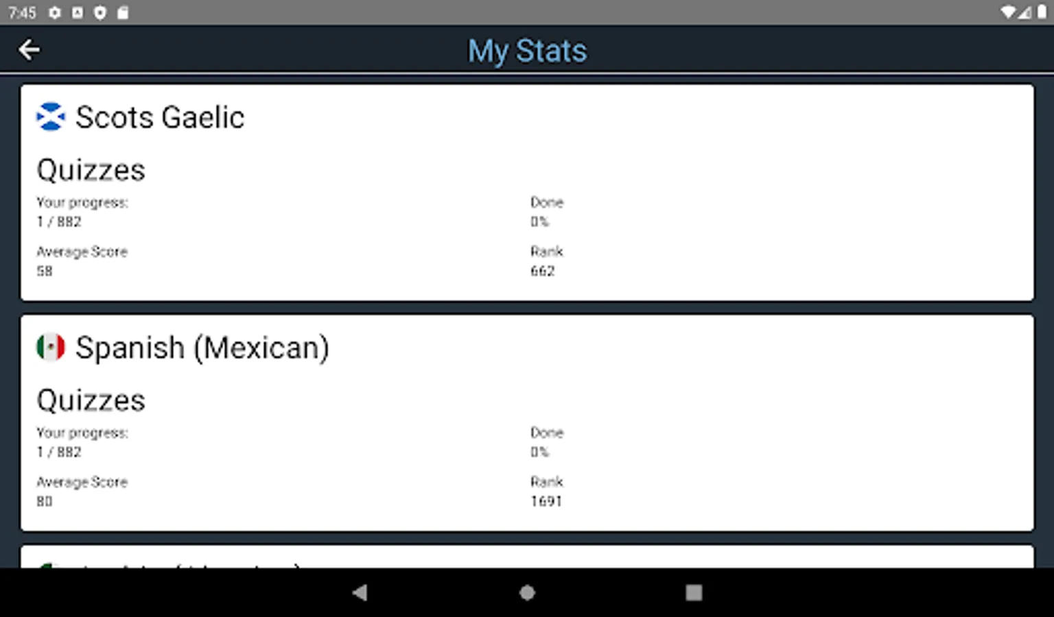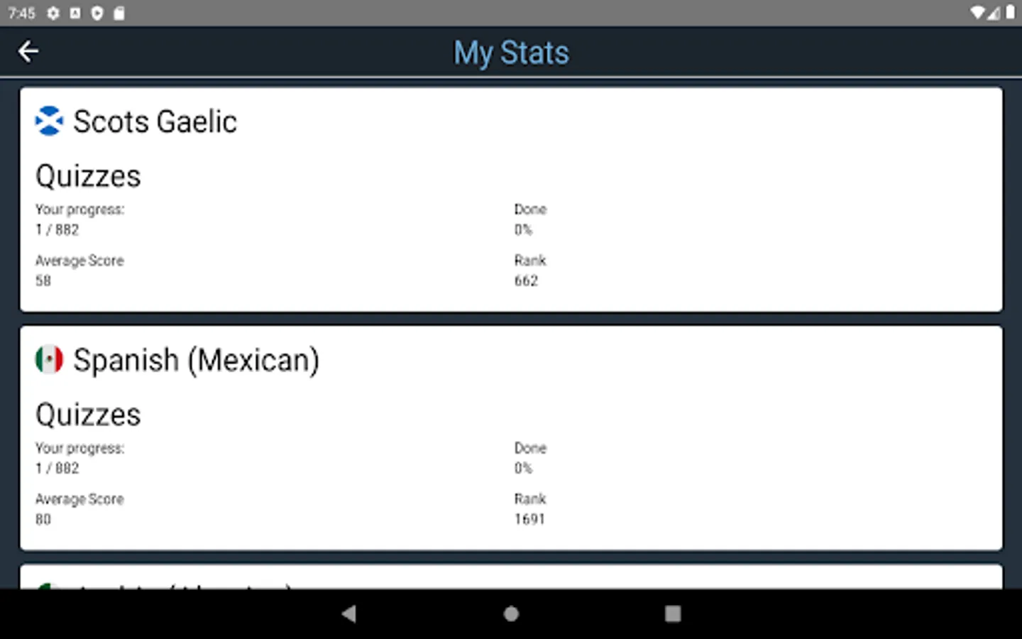 1) Free. You can take the Comprehensive Mexican Spanish Test (non-adaptive) in any language, containing 882 quizzes, and receive a free certificate of proficiency with your CEFR score upon completion. The comprehensive test is the largest such test in the world and takes about 70 hours to complete. You can do the test at your own pace, over as many days as you like. A leaderboard displays your rank against all other test-takers worldwide, and you can easily track your progress at any time.