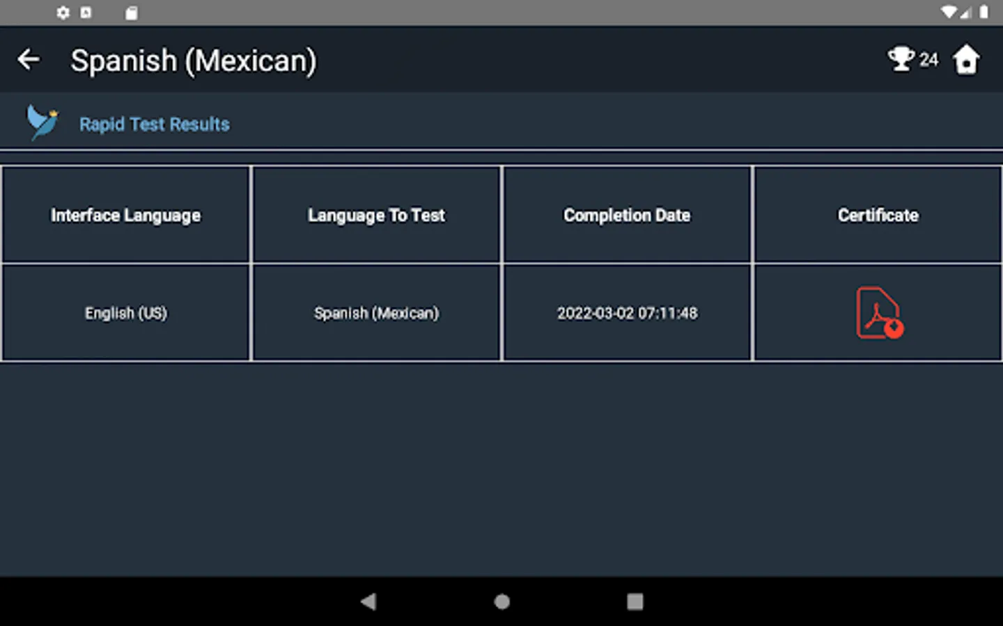 2) Paid. For a low fee, you can take our Rapid Mexican Spanish Adaptive test, which will provide you with a certificate of proficiency with your CEFR score in just 45 minutes. The rapid test uses questions that are progressively more difficult to accurately gauge your level of proficiency.