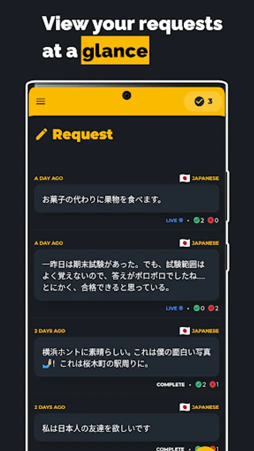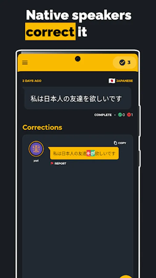 Enter ProofPal. It's like having a native speaker of the language you're using who lives in your pocket, who you can call on whenever you need them to just a have a quick check of what you've written. Post a review request to ProofPal and native speakers will take a look - and either give it the all clear, or write a correction that only you can see.