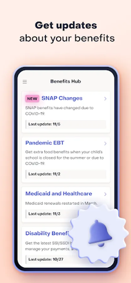 Get regular updates on any important changes to your food stamps (SNAP), P-EBT, Disability, and other benefits in all states.