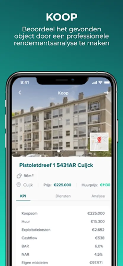 After you have your eye on a potentially suitable object, KOOP helps to make a good assessment of it. You make a professional return analysis of the home you selected. By entering data about the purchase, (possible) financing and operating costs, you can immediately see whether your return target is being achieved and what the expectations are for the next 20 years. This way you know immediately whether a purchase is interesting for you.
