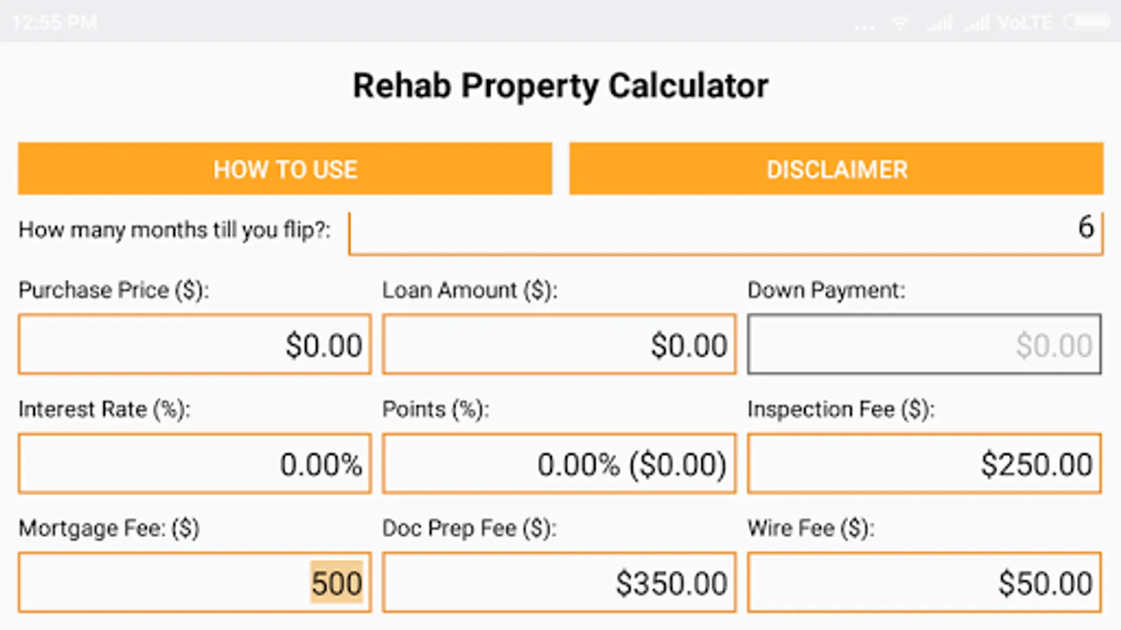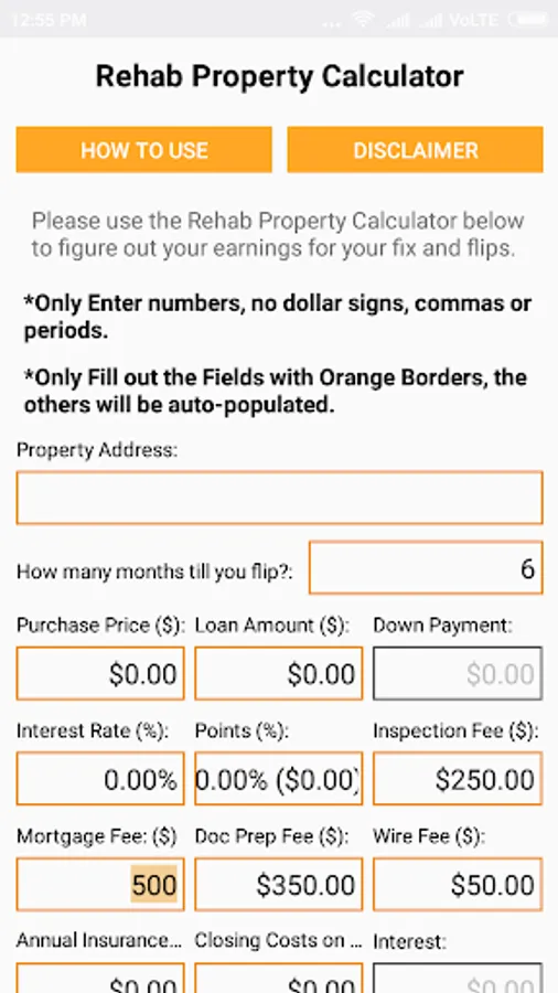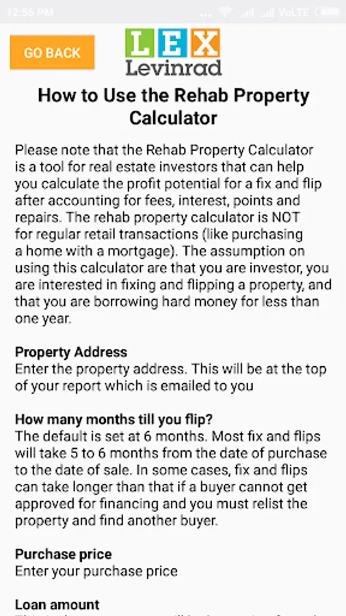 The Rehab Property Calculator enables you to calculate your potential profit on a fix and flip project. The assumptions when using this calculator are that you are that you are fixing and flipping a property, and borrowing hard money or private money for a period of no more than 12 months. Simply enter the purchase price, the loan amount, the interest rate, and the points and fees and other closing costs. Enter your repair estimate of what you think it will cost you to repair the property, and the calculator will let you know how much profit potential there is in the fix and flip. The Rehab Property Calculator will display your Total Cost, Gross Profit, Net Profit, Return on Total Cost, Total Cash Investment, and Return on Cash Investment. When complete the results can be emailed to the email address of your choice. This calculator gives you the ability to compare different potential fix and flip properties and the potential profit in each deal in order to analyze and compare different fix and flip projects.