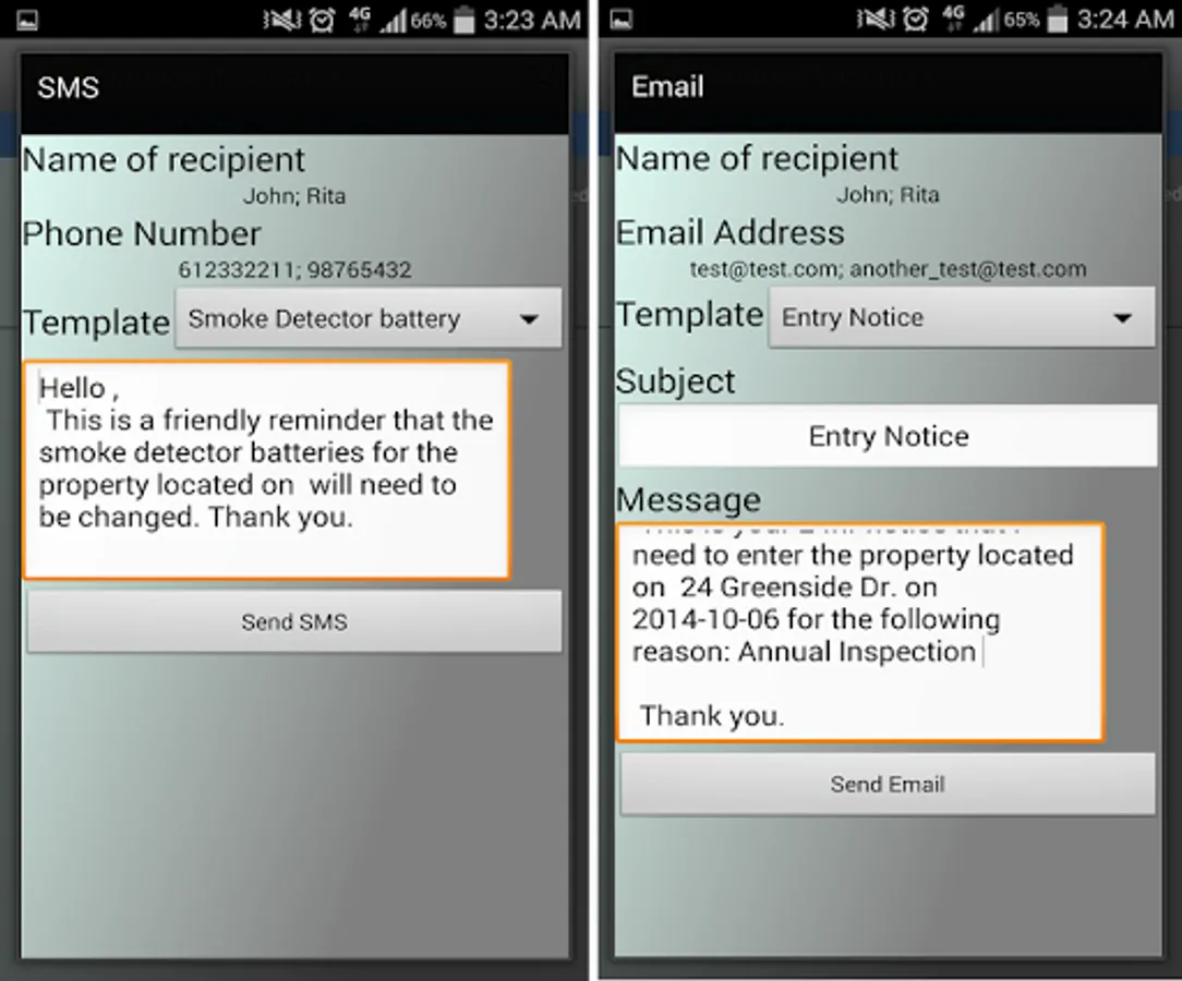 ● Ability to add tenants along with contract info and security deposit, in addition to linking a contract document. You can sms and email each one of them right from the app using predefined template ready ready for you