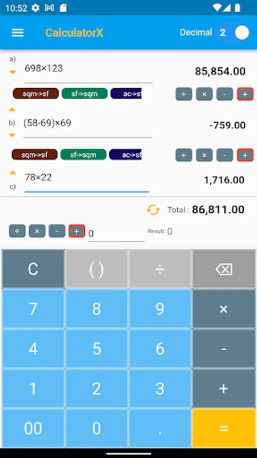 3X Calculator is a 3-line calculator that helps you do calculations in 1 place and easy to do a quick adjustment/modification/trial and error on the partial equation that gives you the desired result.