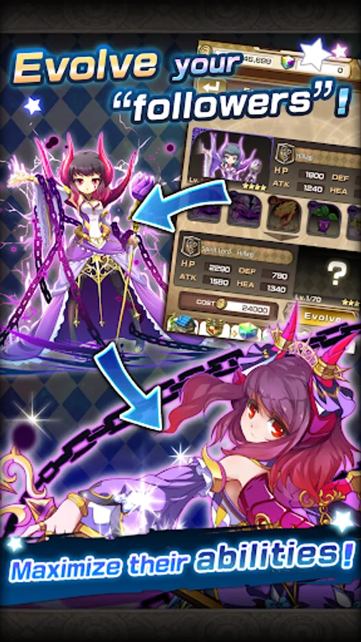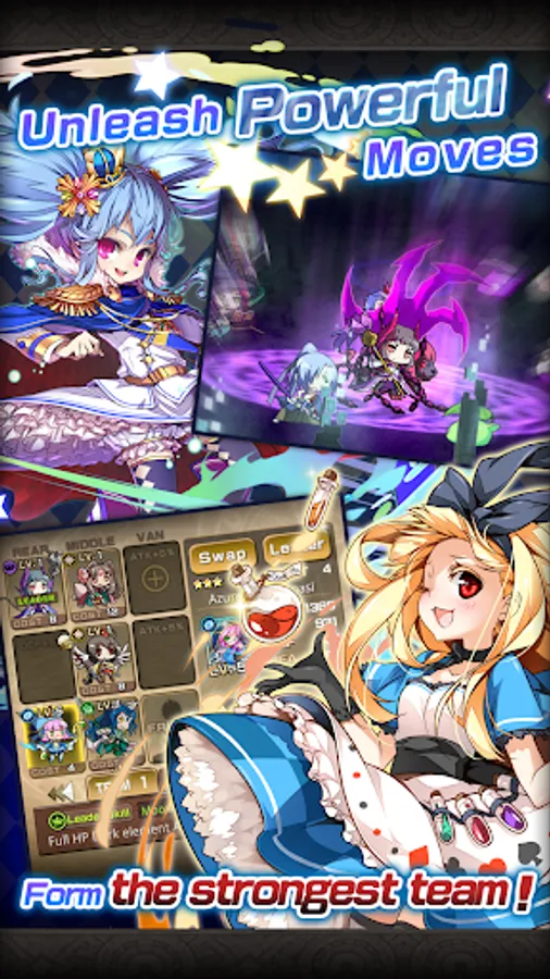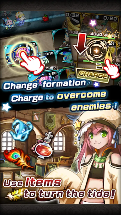 Strategic gameplay! Every character has their own powers, abilities and terrain skills. Carefully position them on the 3x3 formation to turn the tide of the battle! Exploit enemy weaknesses to maximize damage! Combine everything to defeat the toughest enemy!