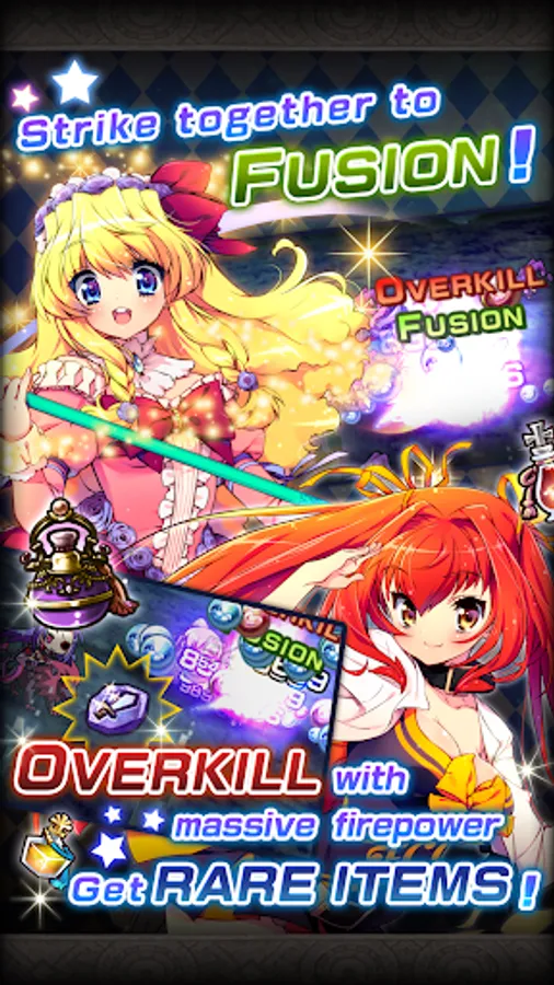When facing tough enemies, focus them down with maximum firepower! Strike together to Fusion! Fusion recovers health and mana, necessary for defeating strong opponents! OVERKILL!! Strike with massive firepower to overkill an enemy! Rumor says overkilling an enemy has a chance to receive rare items...