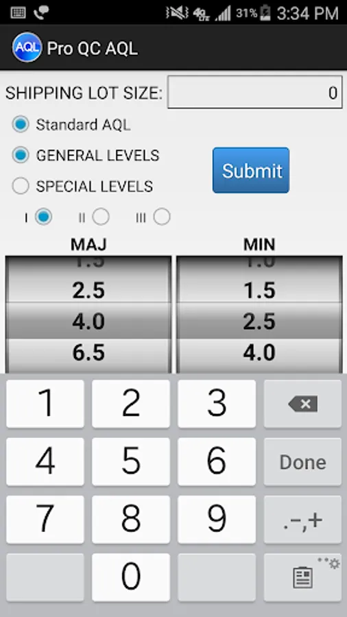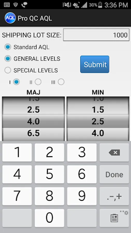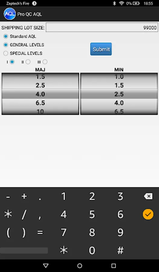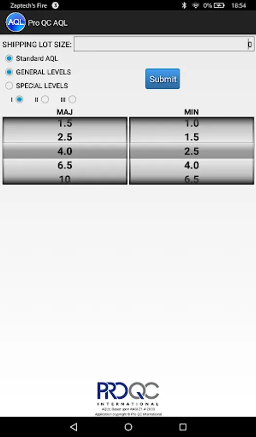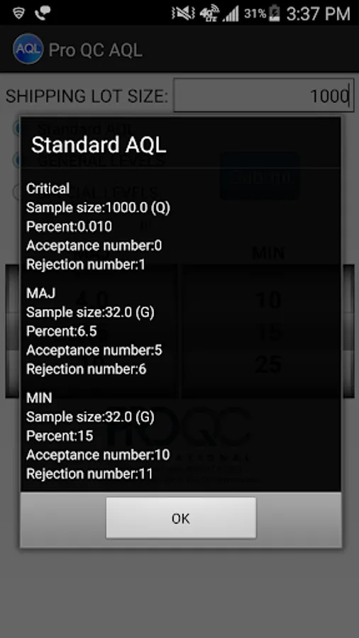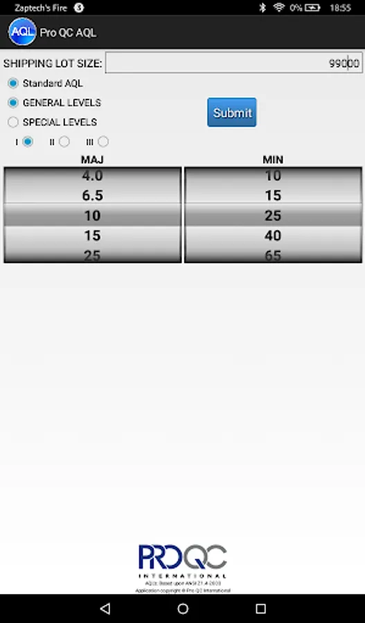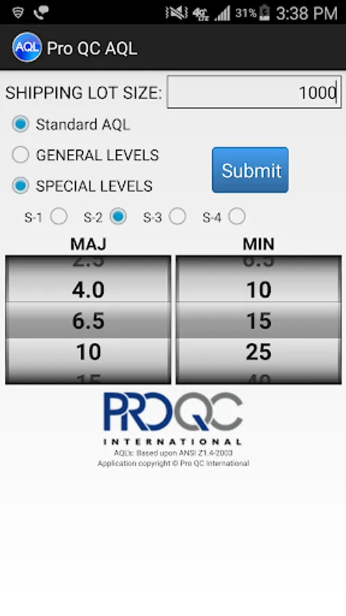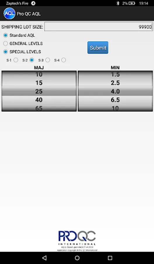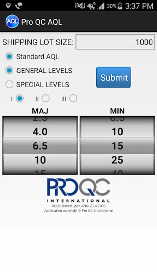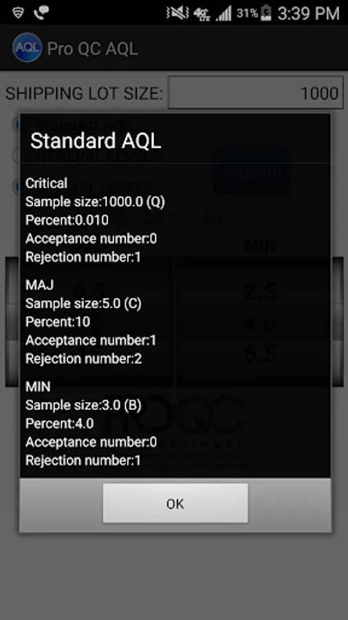 The Pro QC AQL (Acceptance Quality Limit) calculator (based on based upon ANSI Z1.4-2003) makes it easy to determine a sample size and the proper number of allowable rejects in a particular shipping lot size.