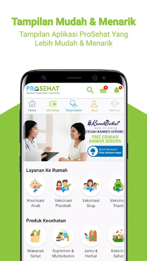 ProSehat hadir untuk mempermudah keluarga modern mendapatkan layanan kesehatan terpercaya mulai dari panggil dokter untuk Imunisasi dan Vaksinasi ke rumah, Rapid Test, panggil fisioterapi, cek lab, pembelian makanan sehat, alat kesehatan, multivitamin, sampai jamu herbal dll yang lengkap.