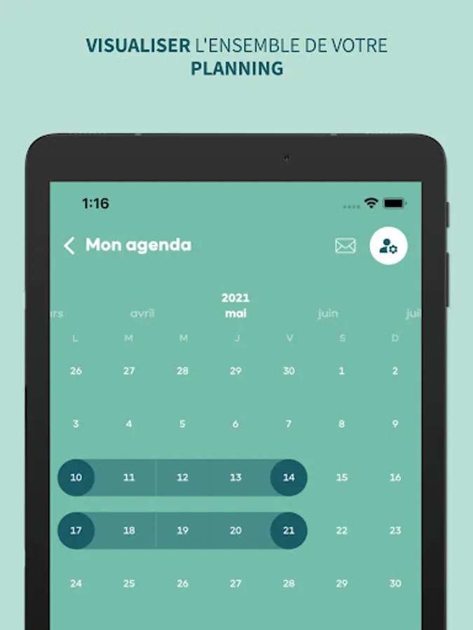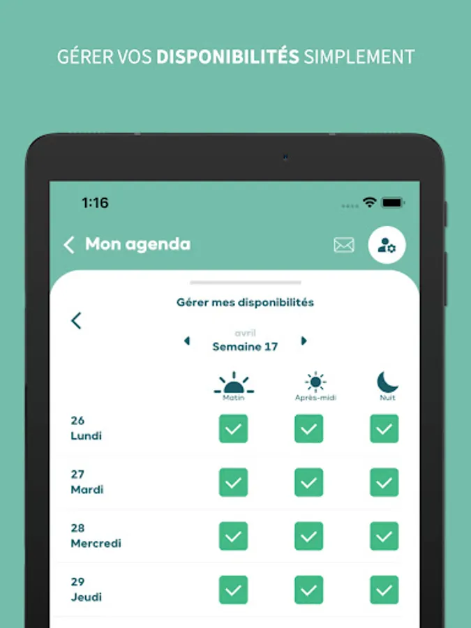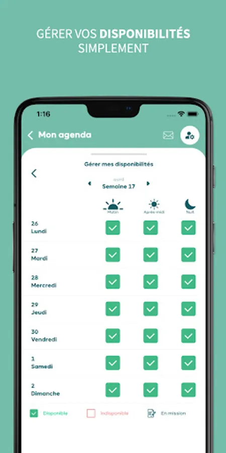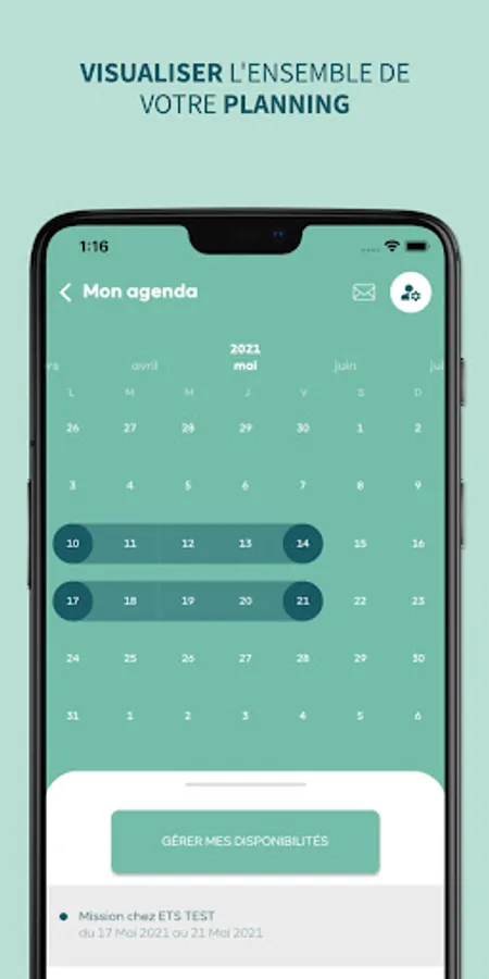 • Retrouver l'ensemble des missions qui vous sont confiées dans votre planning, indiquer vos disponibilités ou indisponibilités,