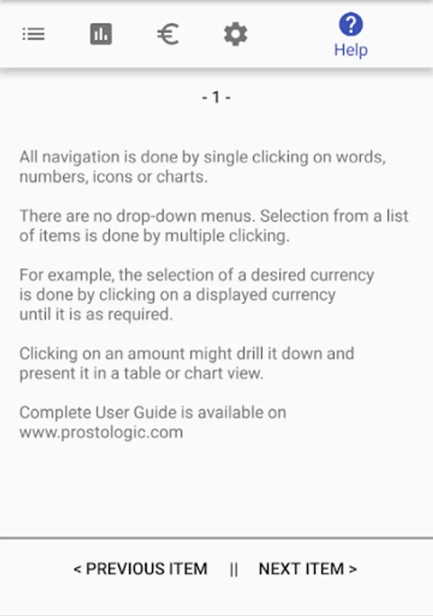 All navigation is done by single clicking on words, numbers, icons or charts. There are no drop-down menus. Selection from a list of items is done by multiple clicking. For example, the selection of a desired currency is done by clicking on a displayed currency until it is as required.
