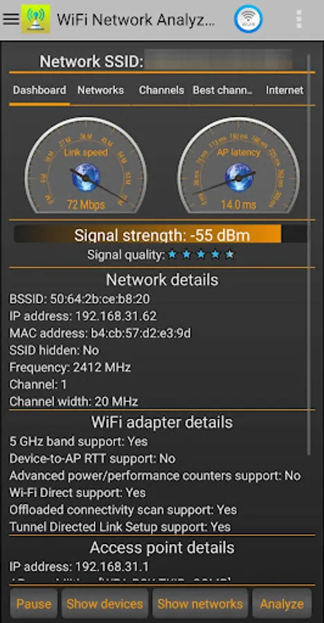 WiFi Monitor is a powerful tool that allows you to analyze the state of WiFi networks and track its parameters (signal strength, frequency, connection speed, etc).