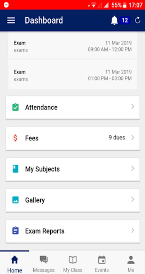 Fees : No more long queues. Now you can pay your school fees instantly on your mobile. All the upcoming fee dues will be listed in the events and you will be reminded with push notifications when the due date is getting closer.