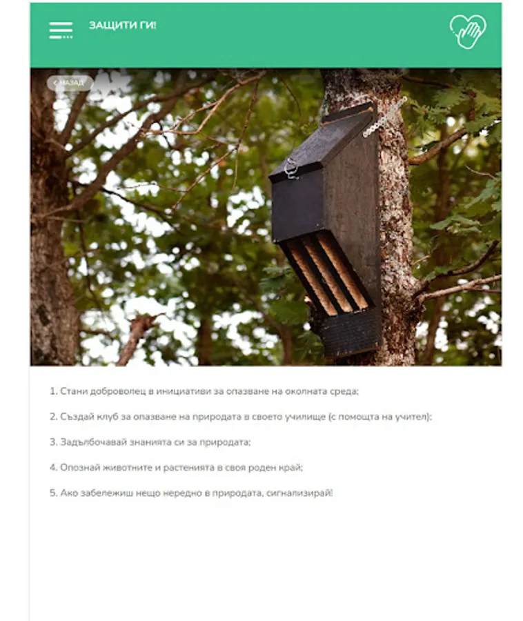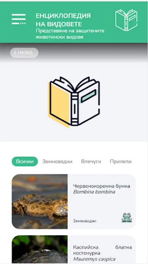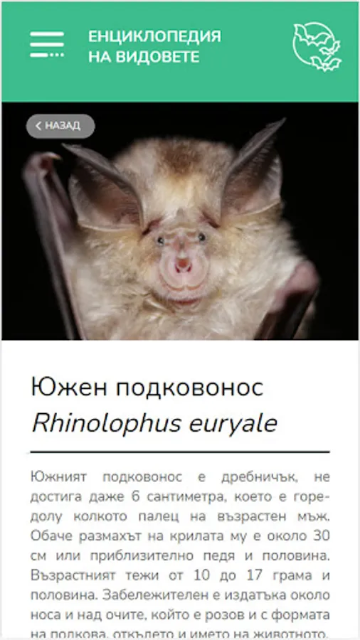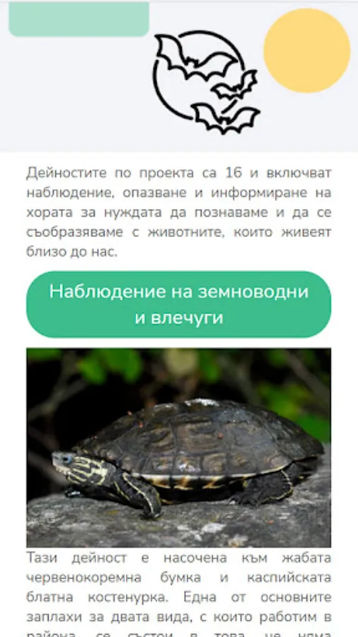 The application presents useful and interesting information about the red-bellied toad, Caspian marsh turtle and 9 species of bats - Horseshoe bat (Rhinilophus mehelyi), Southern horseshoe bat (Rhinolophus euryale), Mediterranean horseshoe bat (Rhinolophus blasii) (Miniopterus schreibersii), long-toed nightingale (Myotis capaccinii), long-toed nightingale (Myotis myotis), broad-eared bat (Barbastella barbastellus), long-eared nightingale (Myotis bechsteinii).