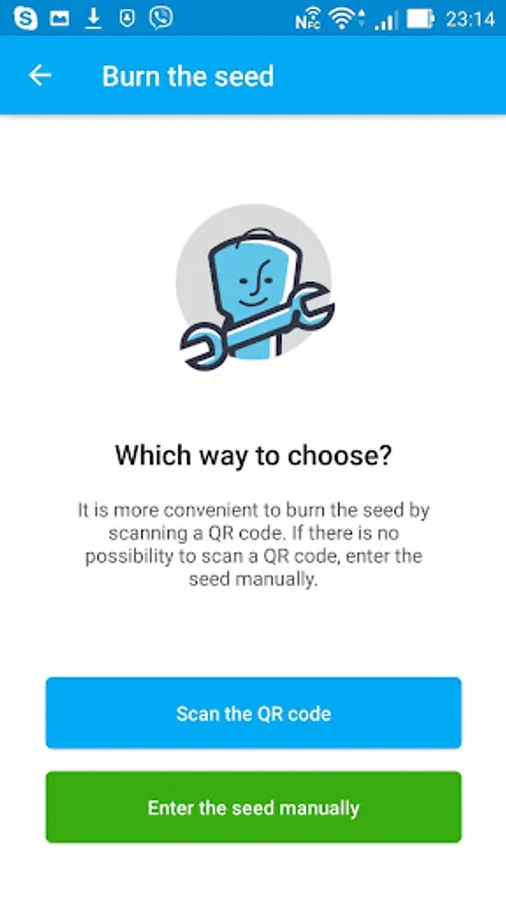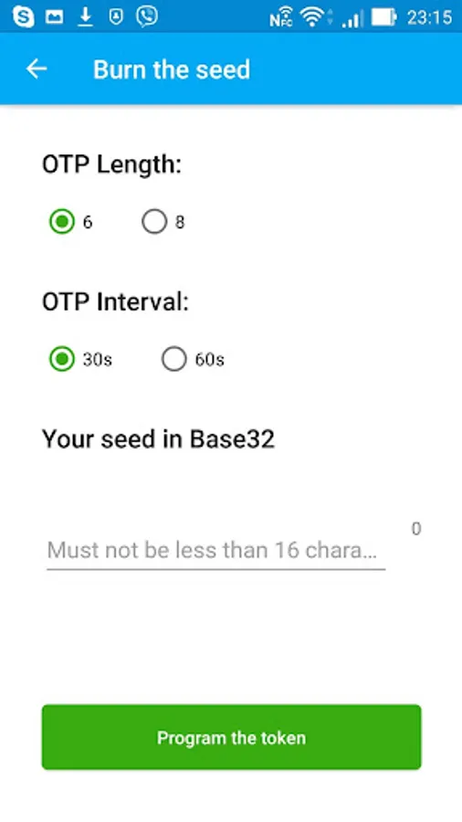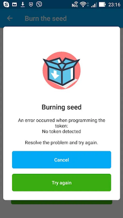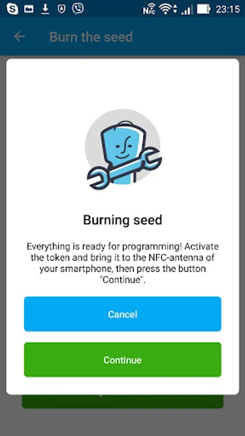 5. Activate the OTP token and place it near your phone's NFC antenna. While holding it near the NFC antenna, tap "Burn the seed" and wait for a message confirming that the 2FA token was programmed successfully.