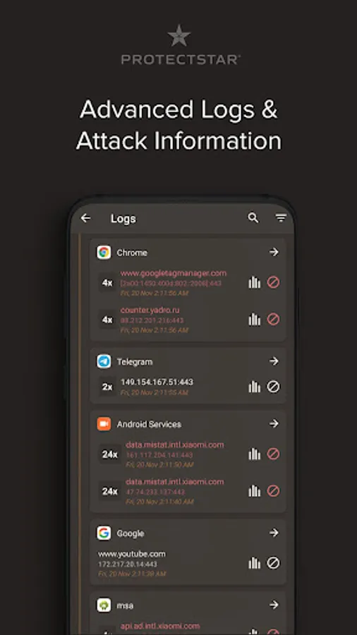 Wouldn't it be great if a firewall security could do much more than spy detection including hacker protection against hacker attacks? The Protectstar™ no-root firewall AI was specially developed as a cybersecurity app to block unwanted access by known intelligence services & government organizations for anti hacker security privacy. With our integrated Intrusion Prevention System (IPS), all known servers & IP addresses from the FBI, CIA, NSA, GCHQ, & many more are automatically blocked. Besides, with wifi blocker you are protected from known spy servers with anti spy hacker protection in countries such as China, Iran, & Russia, as well as from spyware, malware & mobile trackers.
