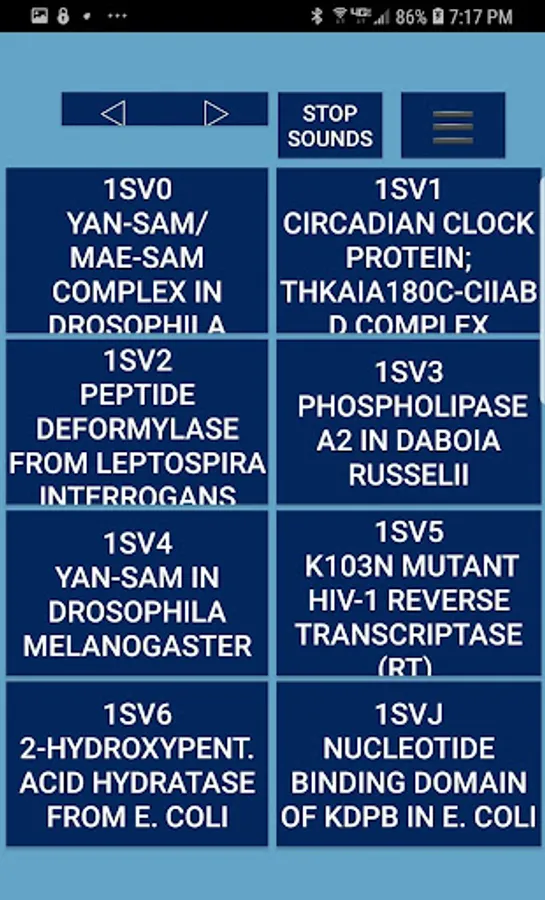 Different screens in this app allow access to different sets of proteins, which can be played via touching the buttons. You can learn more about the proteins at the Protein Data Bank (PDB) https://www.rcsb.org/ (enter the four character code into the search box and you will learn more about each of the proteins).