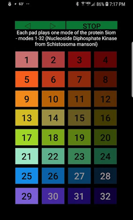 The first three screens give access to a series of proteins, where the vibrations associated with all modes are played simultaneously. The last two screens allows users to play 64 individual modes associated with one protein, with Protein Data Bank code 5iom (this protein is nucleoside diphosphate kinase from schistosoma mansoni, a water-borne parasite of humans).