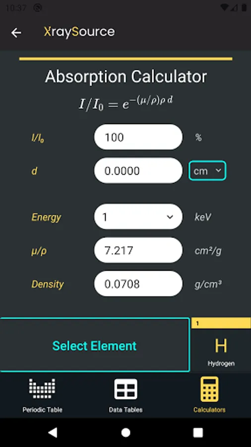 - An absorption calculator, which determines the amount of intensity attenuation to expect from a material with some known thickness or, conversely, how much material is needed to achieve a particular amount of attenuation. In addition, mass-attenuation coefficients can easily be imported from the relevant absorption tables.