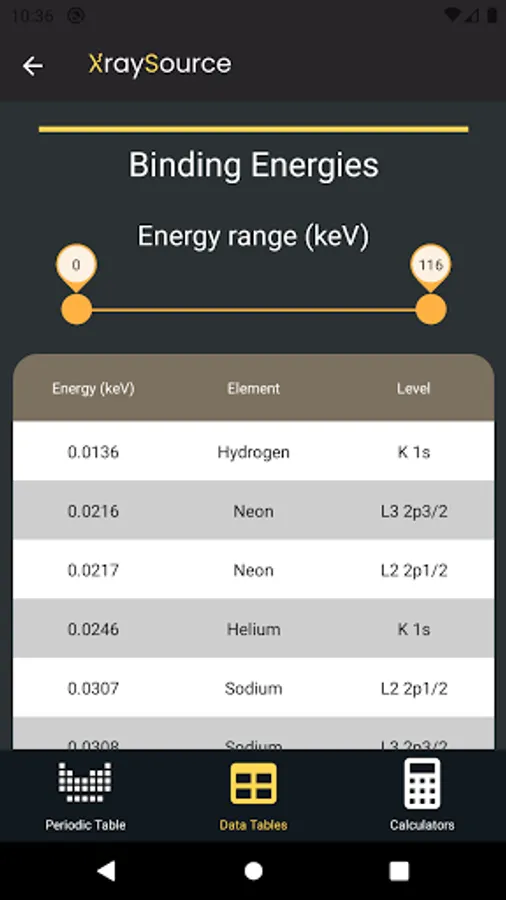 - Periodic table of elements, with easily accessible characteristic line data for each element, as well as other physical properties with thanks to the developers of Mendeleev