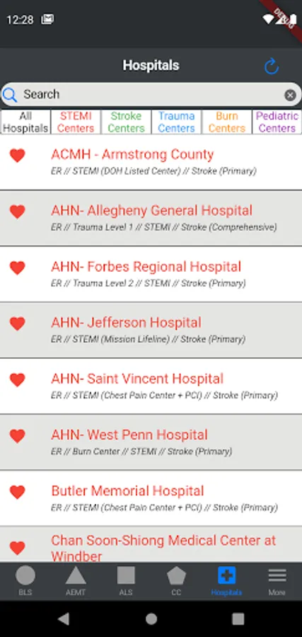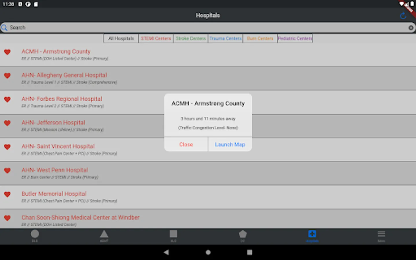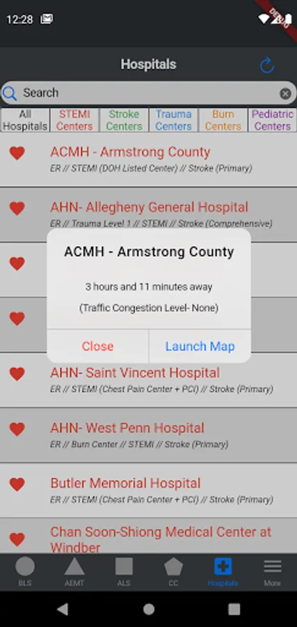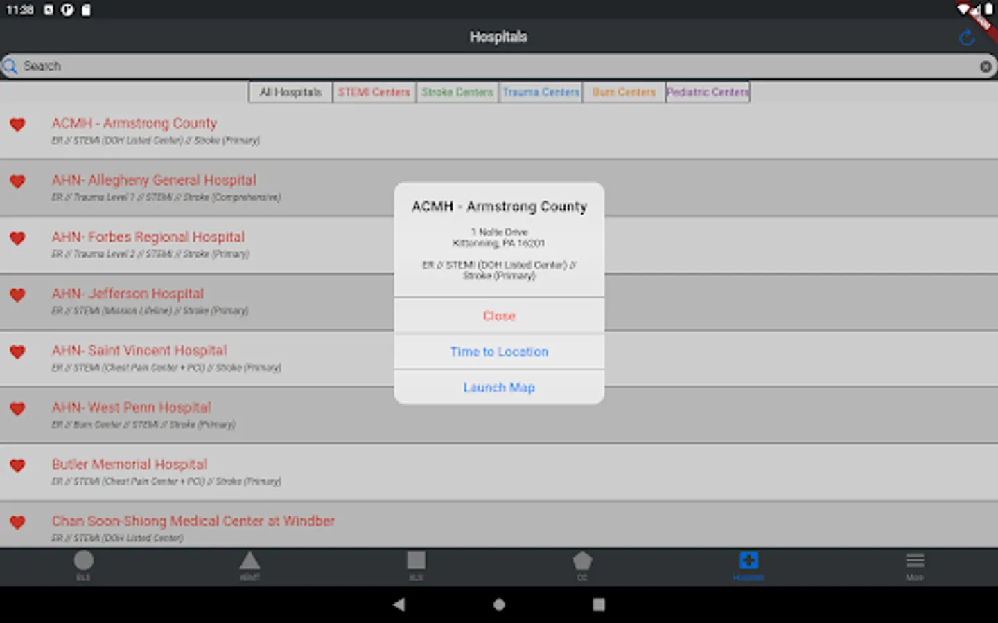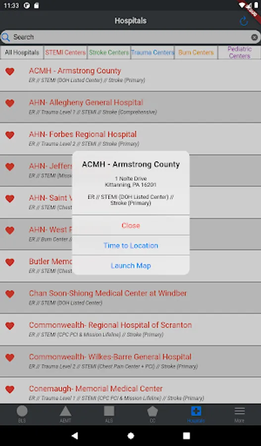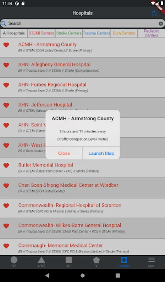 While every effort was made to ensure that the data contained is accurate and up-to-date, providers should be mindful to verify they are always operating in accordance with protocols published by the Commonwealth, regional guidance, and the providers respective scope of practice and certification levels. This app also features categorizing and filtering resources by whether or not they were a designated STEMI, stroke, trauma, burn, or pediatric center. Any corrections should be sent in to support immediately.