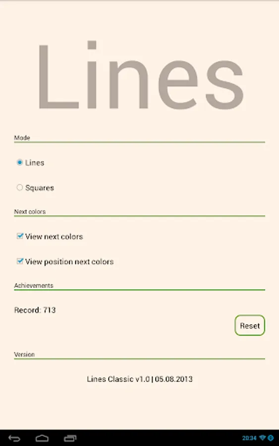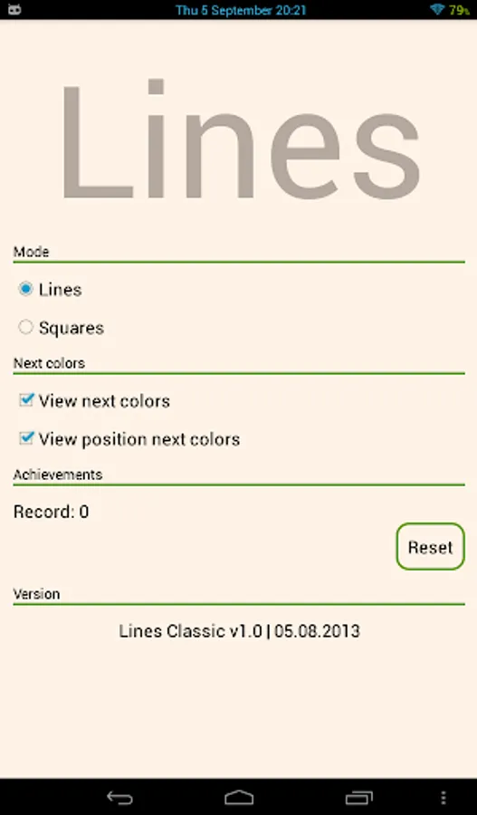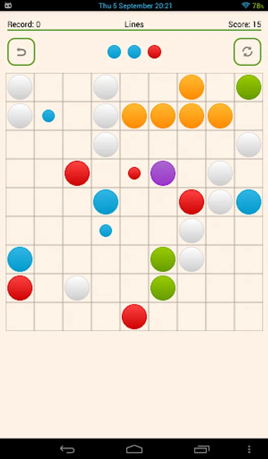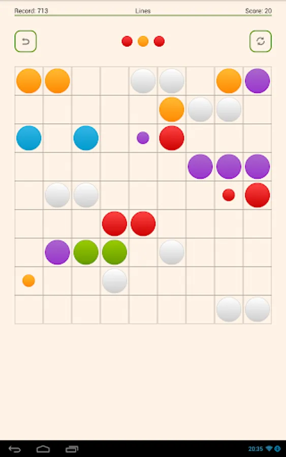 The game starts with a 9×9 board with three balls chosen out of seven different colours. The player can move one ball per turn, and the player may only move a ball to a particular place if there is a path (linked set of vertical and horizontal empty cells) between the current position of the ball and the desired destination. The goal is to remove balls by forming lines (horizontal, vertical or diagonal) of at least five balls of the same colour. If the player does form such lines of at least five balls of the same colour, the balls in those lines disappear, and he gains one turn, i.e. he can move another ball. If not, three new balls are added, and the game continues until the board is full.