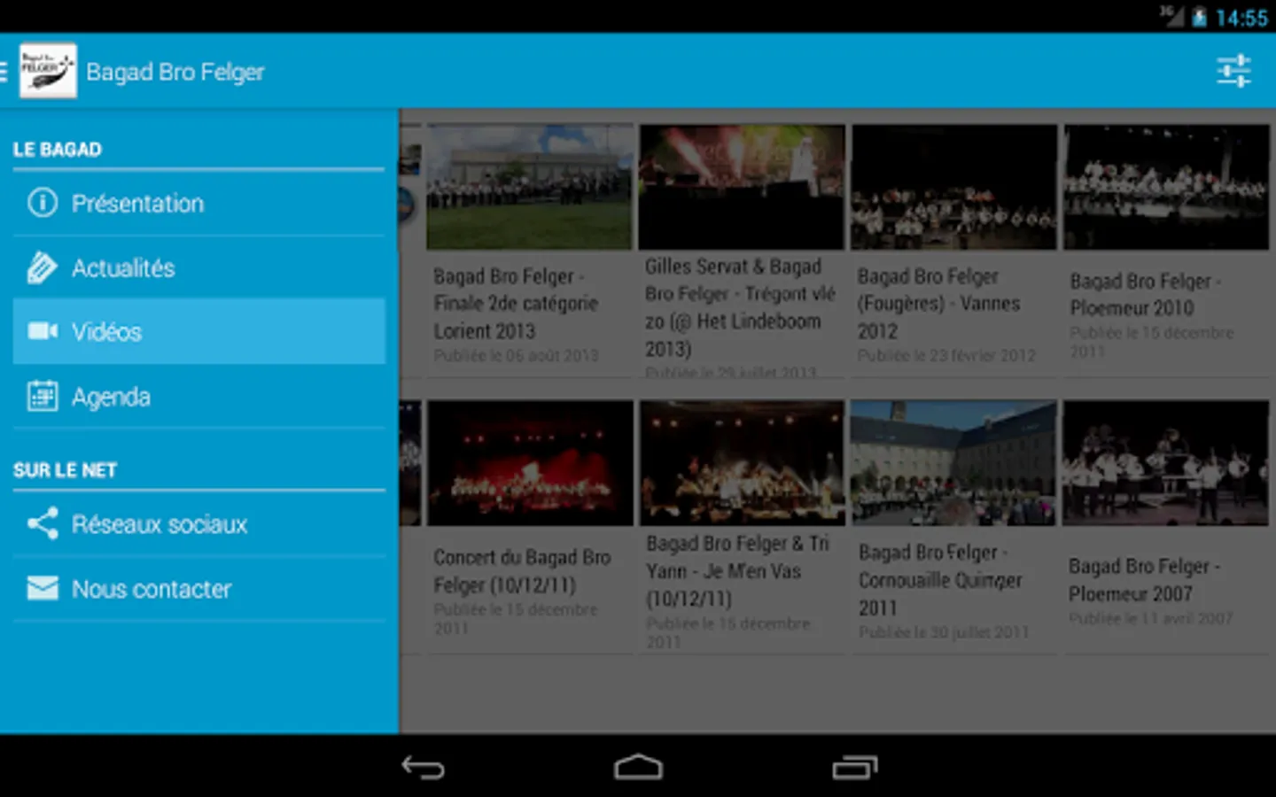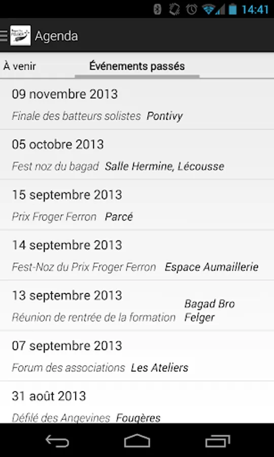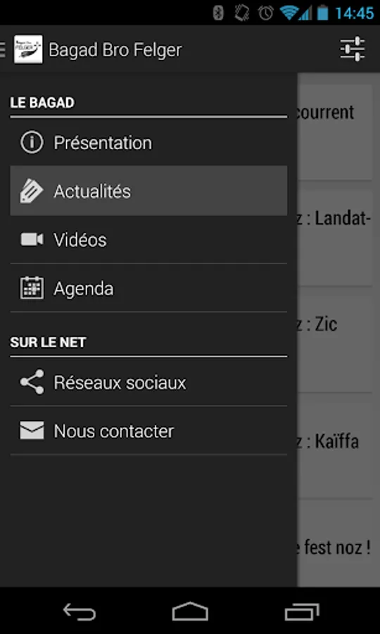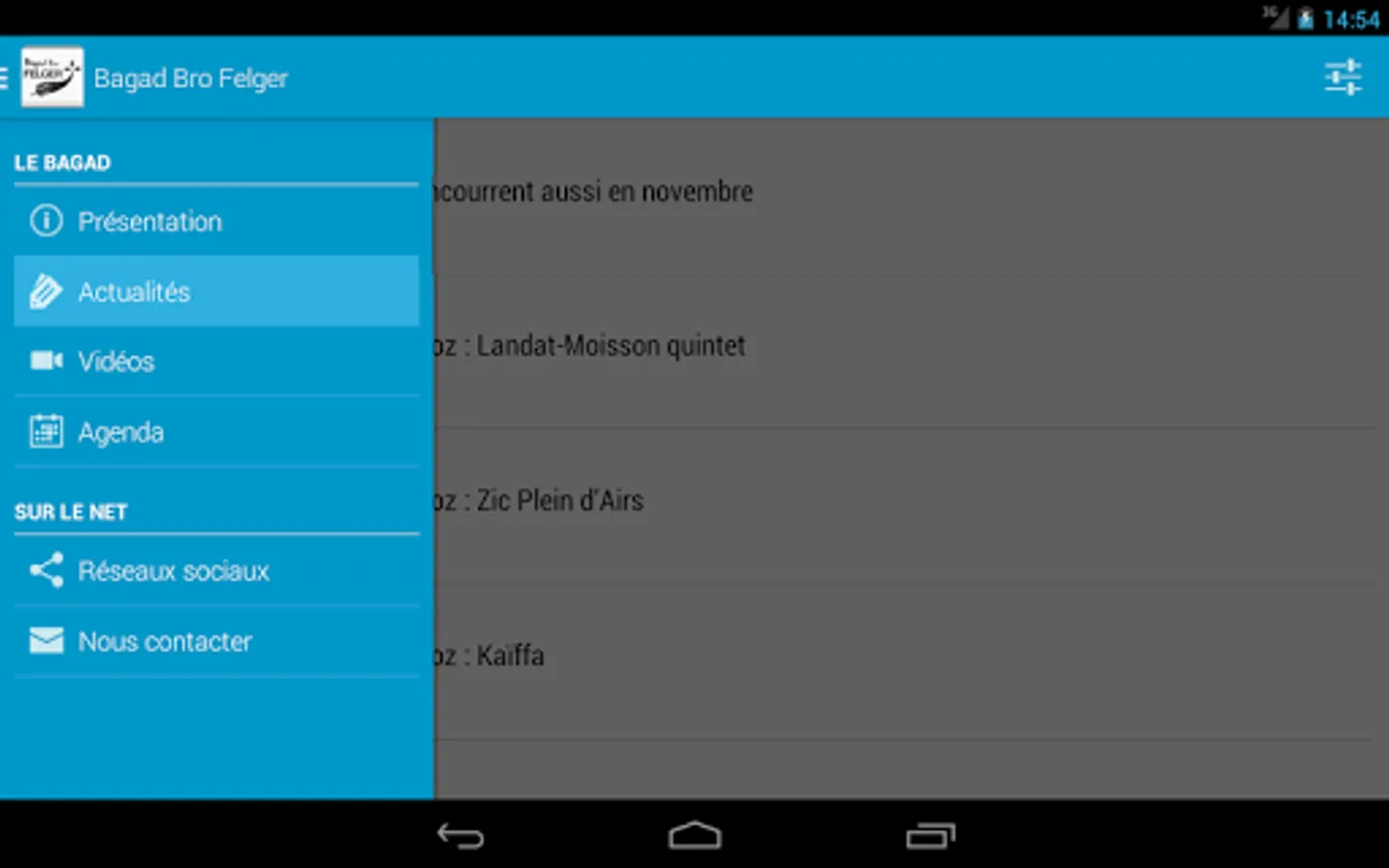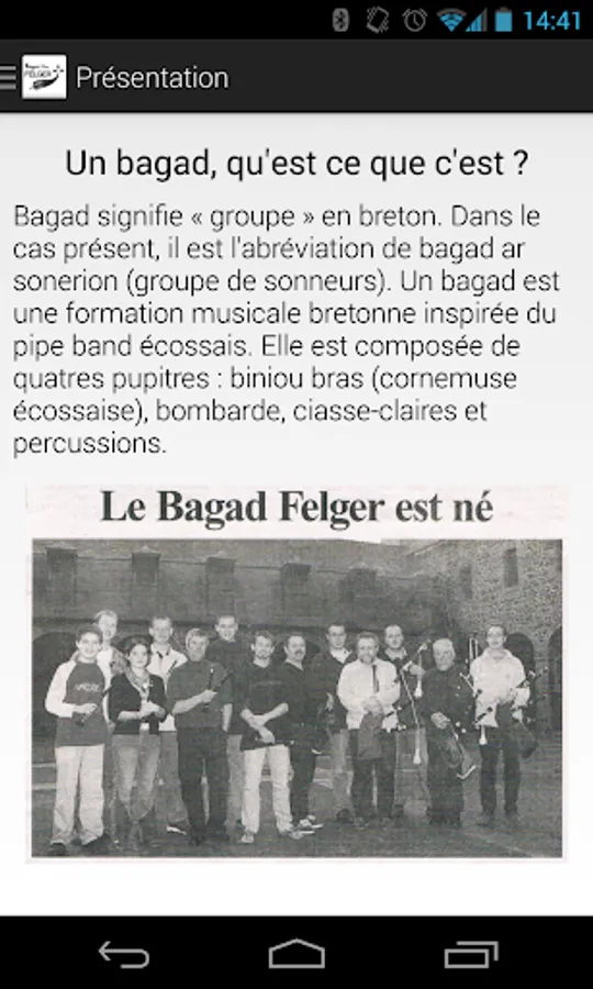 The application is translated in english, however lot of content come from the bagad's website, which is in french only (e.g. news, calendar).