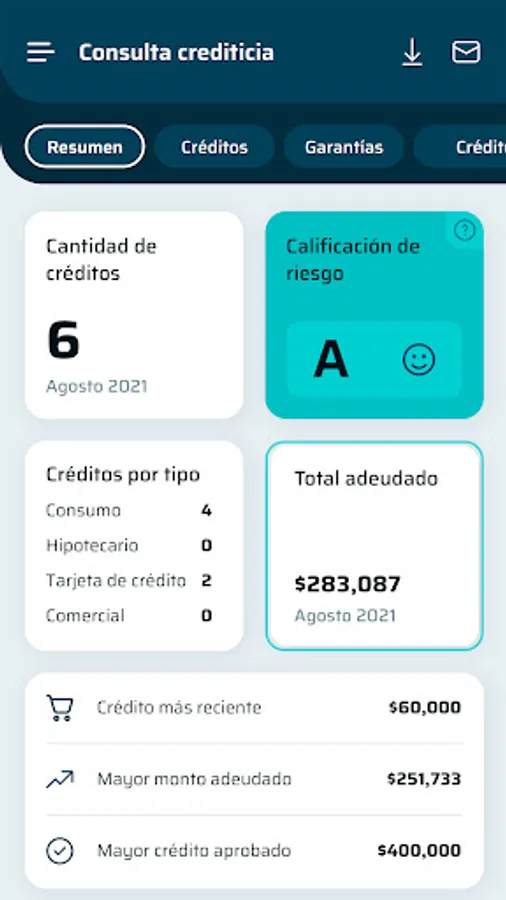 In the Credit Consultation you will see a personalized report of your credits in the national financial system, in a consolidated way and by type. In addition, it includes financial indicators and the credit risk rating that you have in the financial system; as reported to the Superintendency of Banks by the financial intermediation entities that make up said system.
