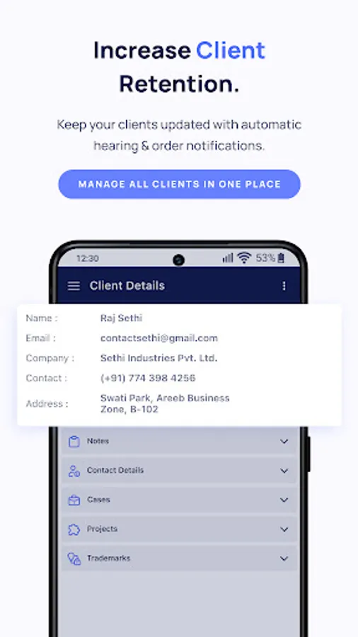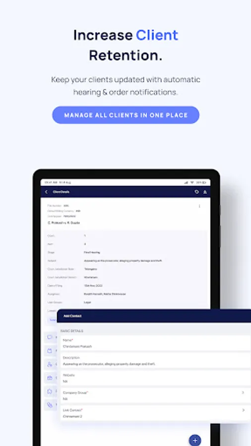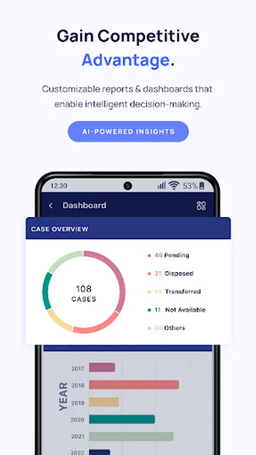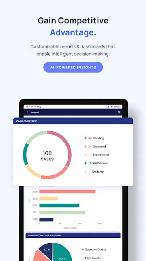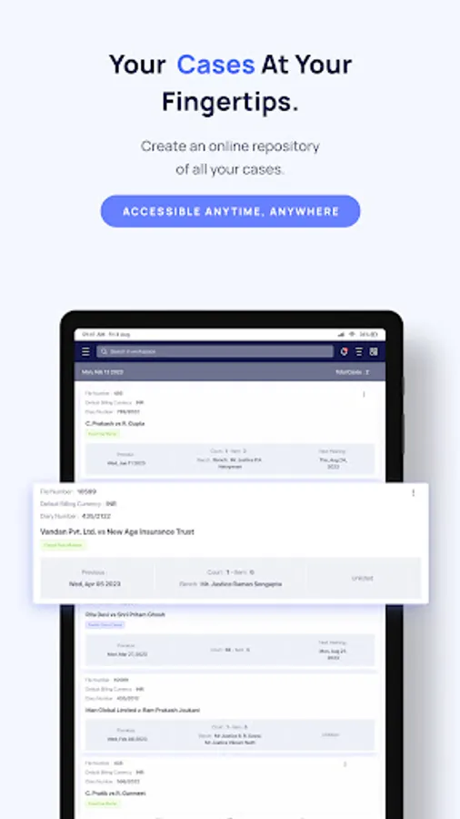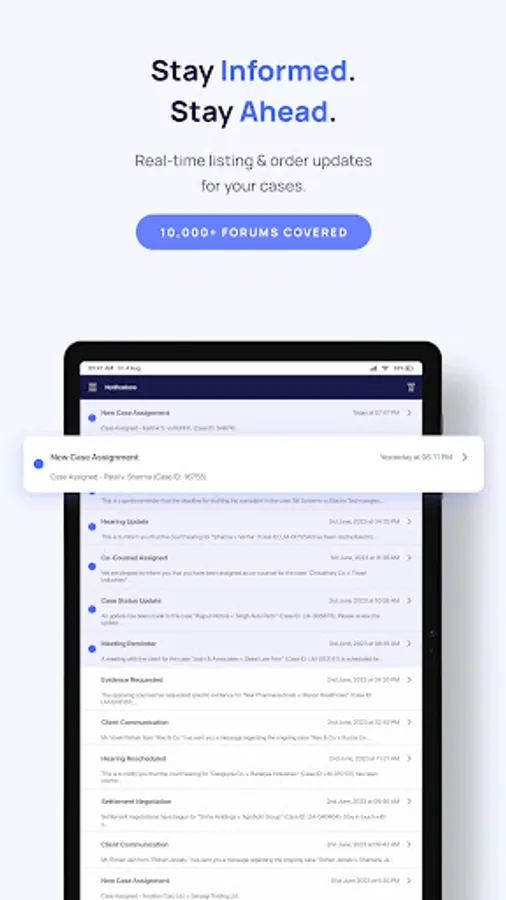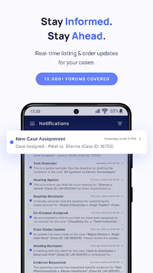 1. Get real-time automatic case updates about hearing dates, orders, judgments, office reports, and more from 10,000+ courts, trademark registries, patent registries and other sources of public legal data. Just add new cases & get regular case-related updates on the app.