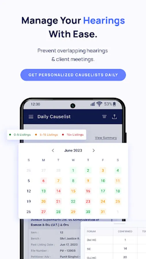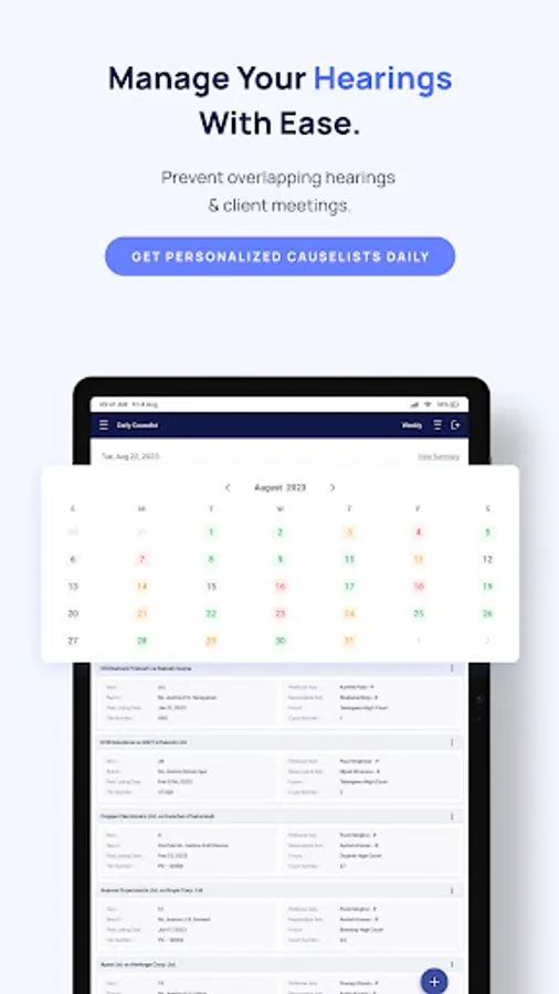 3. Get personalized daily causelists that help you plan your day proactively and sail through multiple hearings smoothly. With an overall Calendar View, you can see all your hearings scheduled in the month at a glance and prevent overlapping engagements.