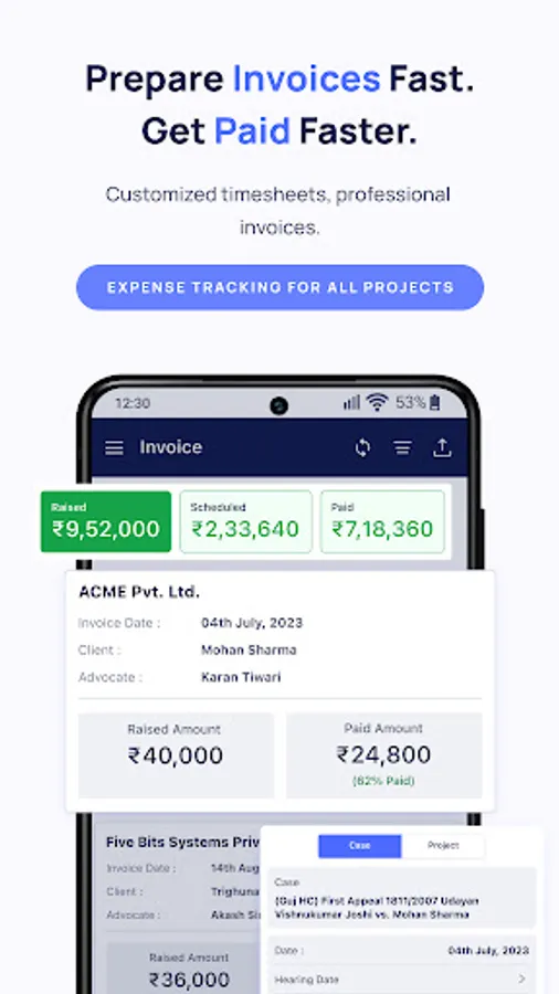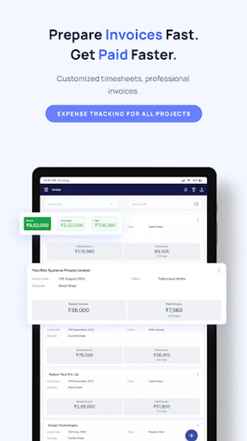 4. Generate professional invoices, approve and share them with your clients. Our invoicing feature supports all billing preferences like, hourly rates, flat fees, and retainer-based billing.