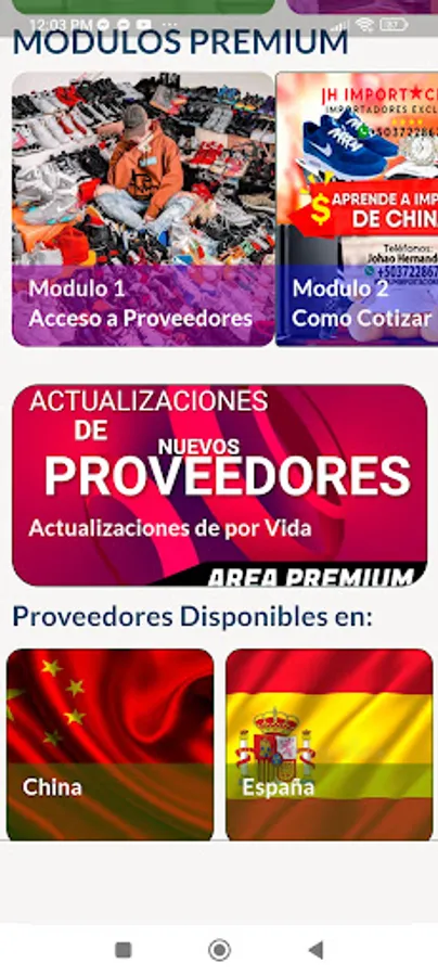 In this application you will find more than 30 Chinese suppliers of different products such as shoes, clothing, watches, bags, belts, clothing, jewelry and much more, you will also have access to Spanish Supplier, Mexican Supplier, Guatemalan Supplier, Argentine Supplier, Colombian Supplier, liquidators Wholesalers in the USA of 100% original wholesale products, liquidating wholesalers sell footwear, ps5, cell phones, electronics, makeup and thousands of original products, access to the import course where you will learn many important topics for your new business.