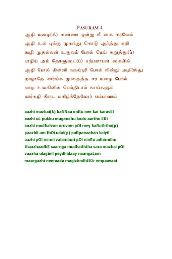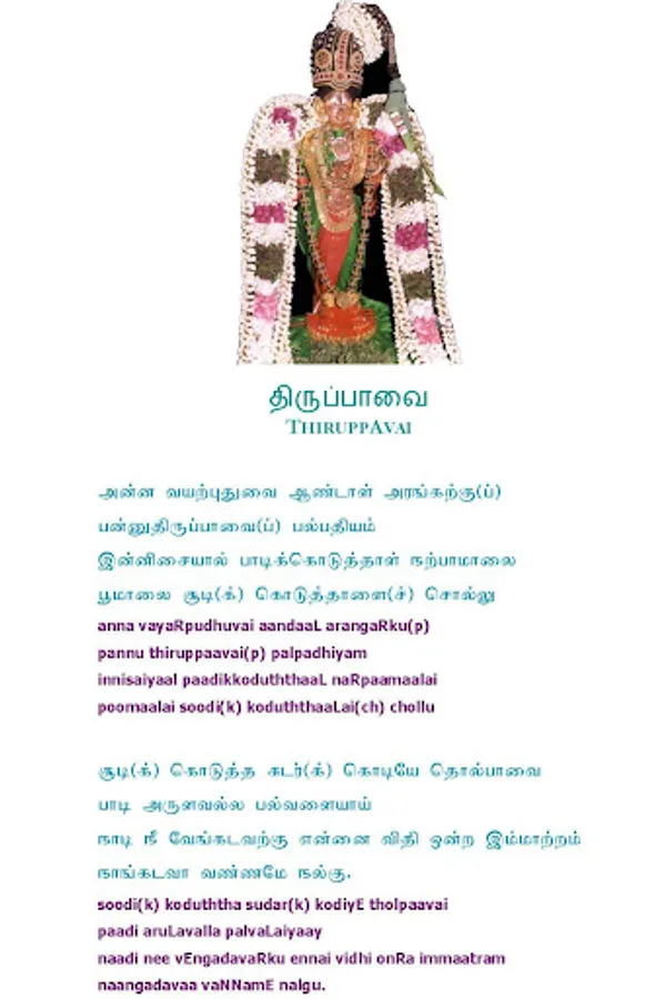 This app is designed for everyone to recite Andaal Thiruppavai Pasuram by Pasuram. Please pour your reviews about this app.We will be happy to see when this app reaches more people across the globe.