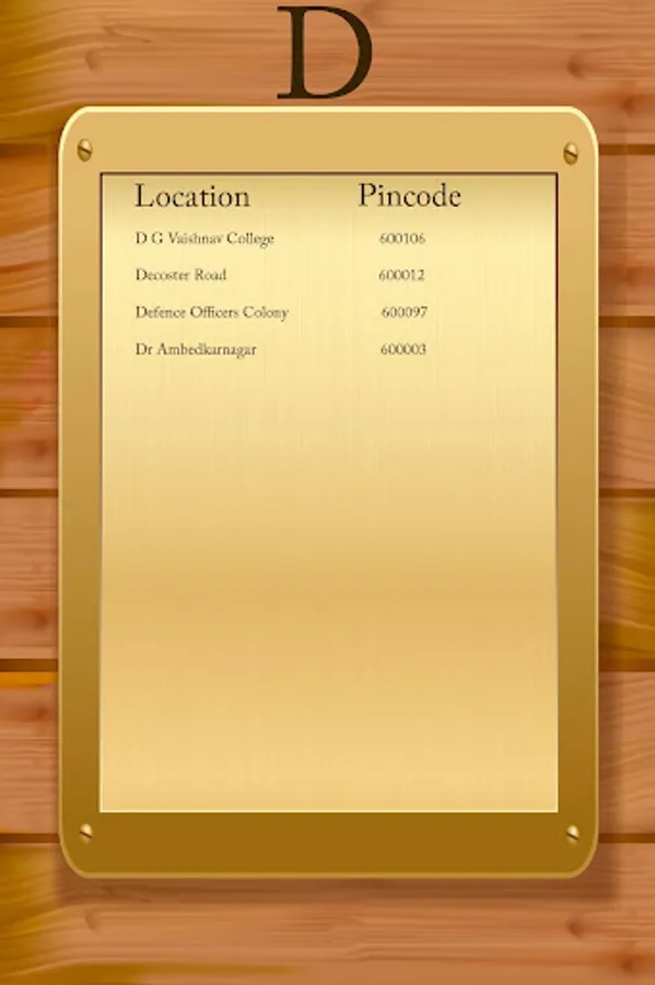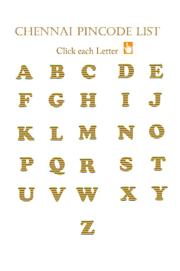 Chennai Pin codes List is a handy app, where you will easily know about the Chennai Pincode's / Postal code of Chennai City, soon we will try to incorporate India and its major City Pin codes. This Android app is an easy to use, click the Alphabets of your desired place, you will see the list of Pin codes in Chennai.