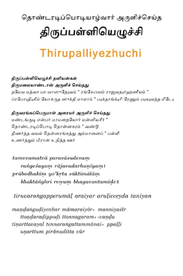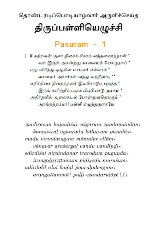 Auspicious Thirupalliyezhuchi Pasurams by Thondaradippodi Alwar, this app contains Tamil and English with Audio for Each pasuram.