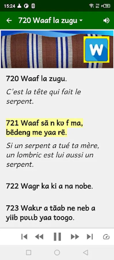 En appuyant sur l'icône du haut-parleur en haut à droite et sur le bouton «Play» en bas de l'écran, vous pouvez lire et écouter ces proverbes lus pour vous.