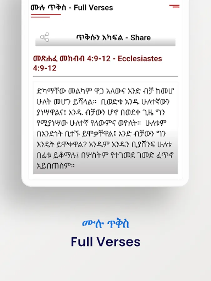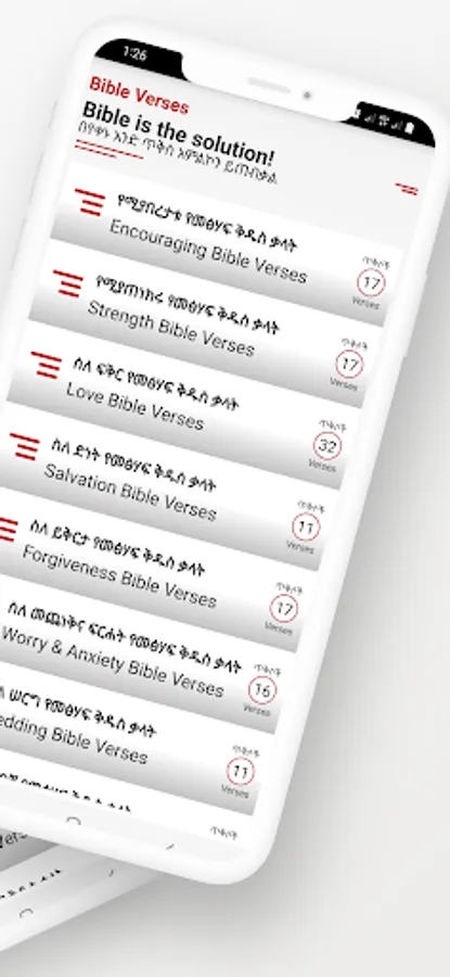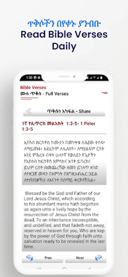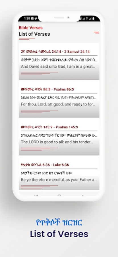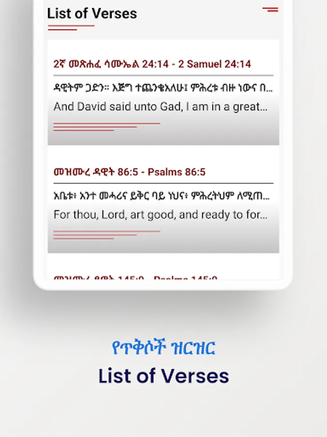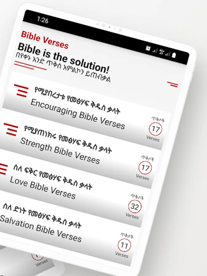 In this App there are over 500 Verses, Quotes, Proverbs … which are from different parts of the Bible, this will help us to read only parts of Bible we want to read about. And this App is in both in Amharic (Ethiopian Language) and in English.