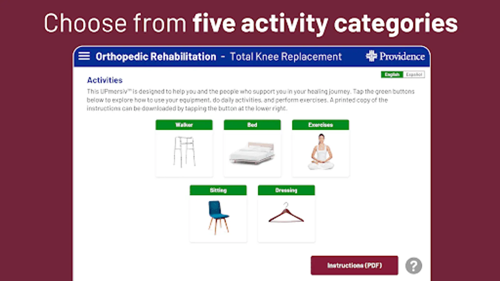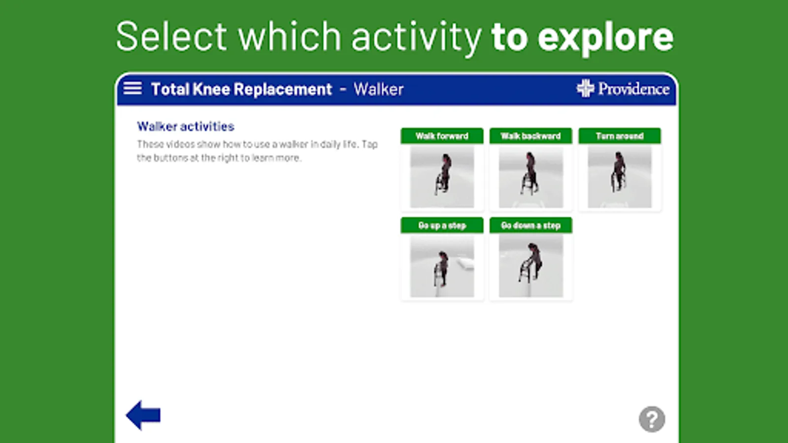 The Providence UPmersiv™ Orthopedics app is your on-demand guide to building strength and range of motion after a total knee replacement.