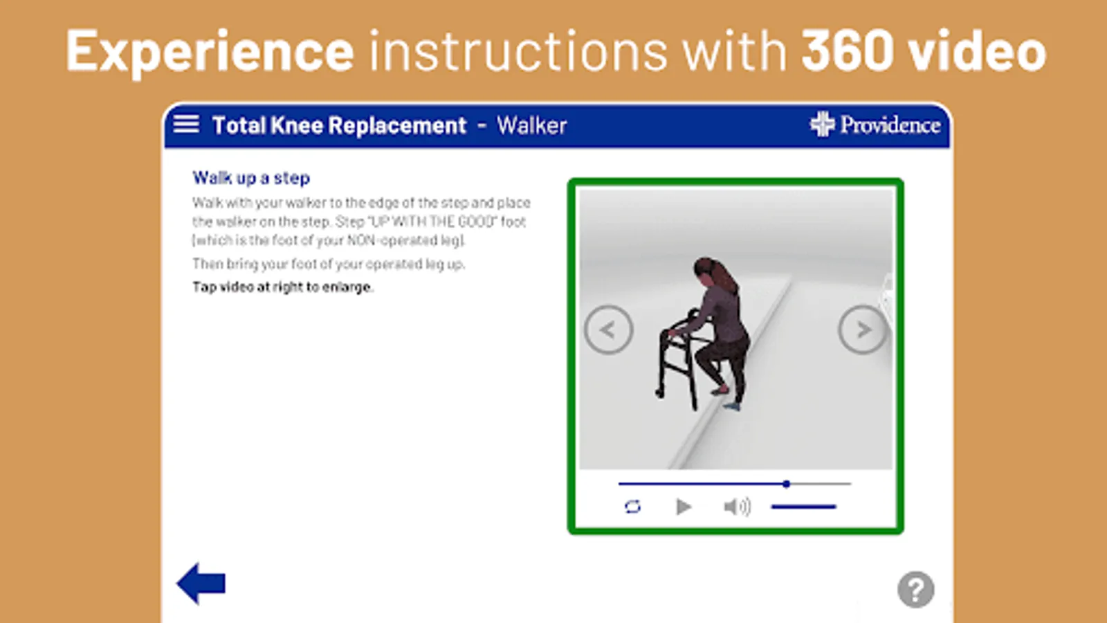 Developed in collaboration with physical therapists, this app supplements the Providence Joint Replacement Handbook and provides step-by-step instructions for daily activities and exercises. Verbal and written instructions accompany interactive 360° videos that allow you to see activities from all angles (front, back, left, right, top), so nothing is hidden or out of view!